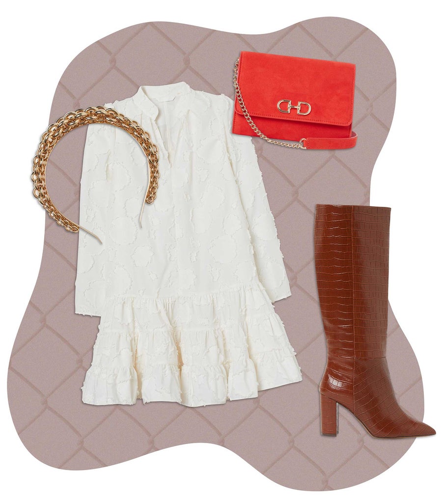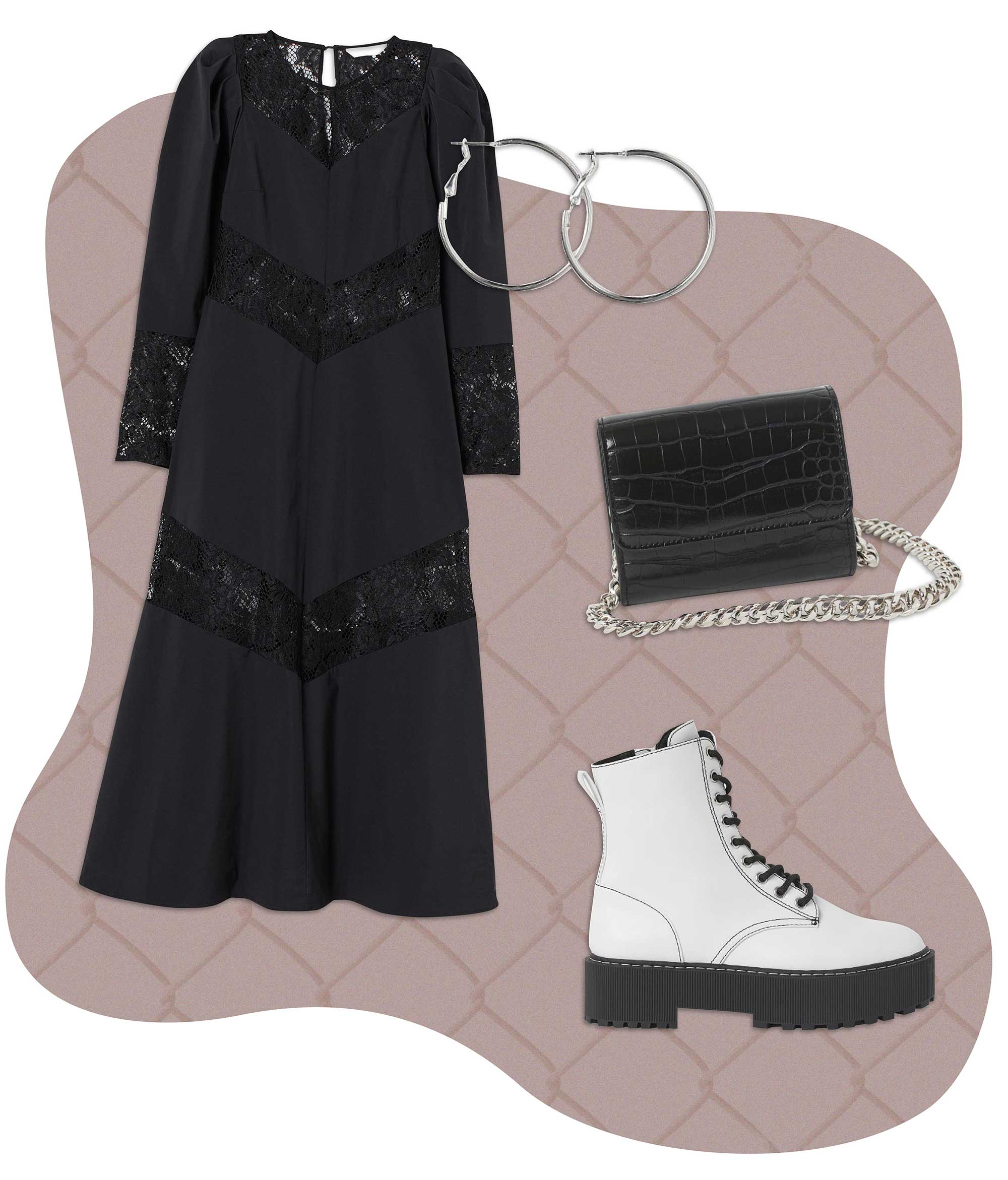 We’re not in the 19th century anymore. Made from 100% recycled polyester, the dress is only old-time-y in shape; modernize it even further with a stark white lug-sole boot, hoops, and a chain-handle bag that’s just the right size for holding your wallet, keys, and newfangled cell phone device.