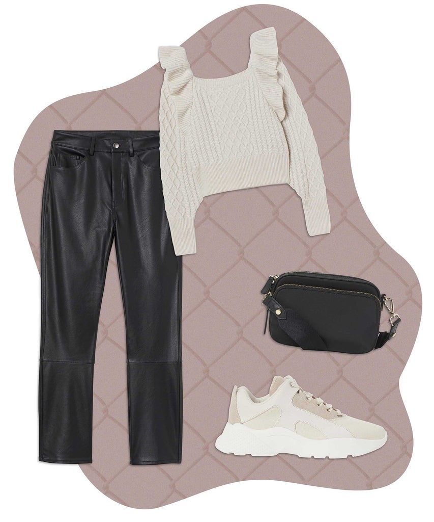 Pinafore-inspired sweater, meet leather trousers. Continuing the theme of sweet-meets-street, we’ve added a sporty trainer and a bag with utility details.
