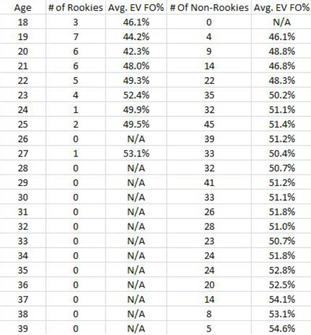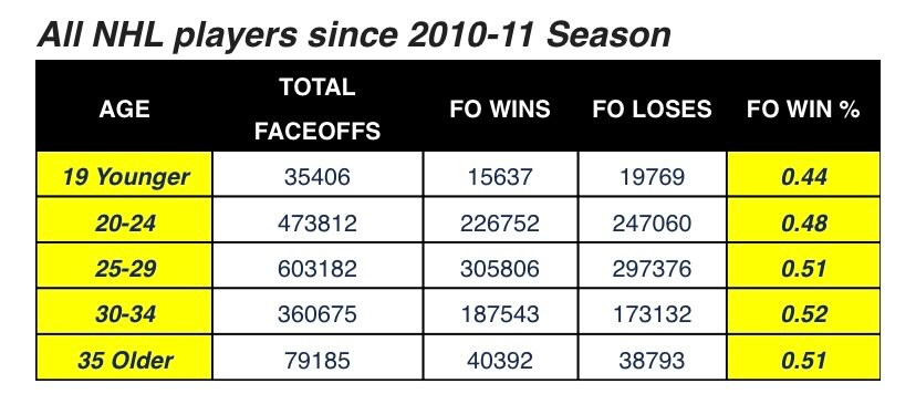 I had our stats department take a look to see if there’s a general correlation between age and faceoff winning percentage, and here’s what they found by putting ages into some larger buckets: