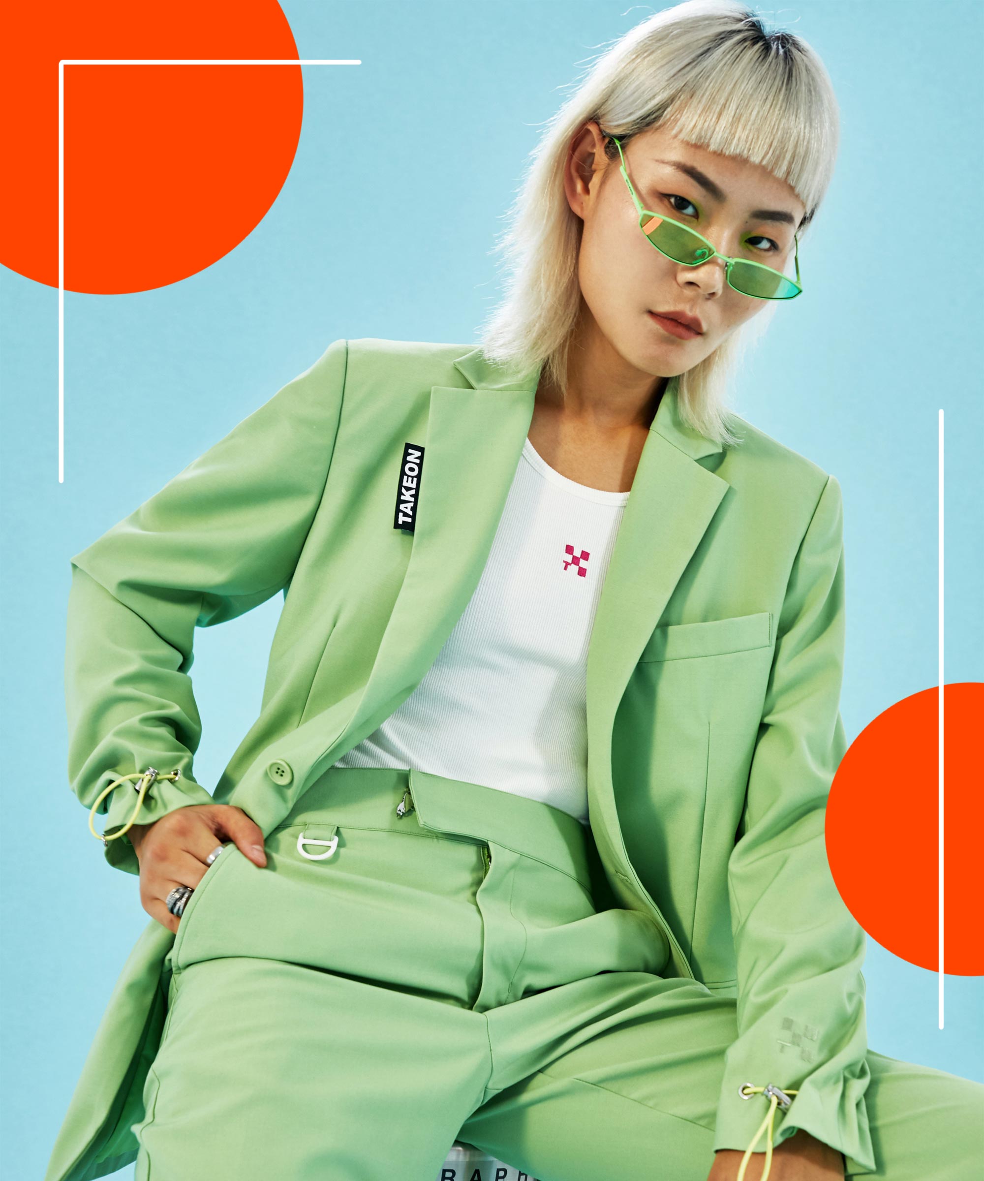 For TAKEON, the decision to design unisex clothing meant ideating a completely new style of streetwear. “Both men and women want functionality and tailoring,” Ma says, adding that it’s rare to find either in streetwear. To remedy that, she began experimenting with suiting that was still casual and cool like the streetwear she grew up with, but modernized. “Women want a blazer set that doesn’t have to be so dressy that can match with your sneakers,” she says. “Streetwear doesn’t always have to stay within the boundaries of what we know — it’s ever-evolving and changing.”