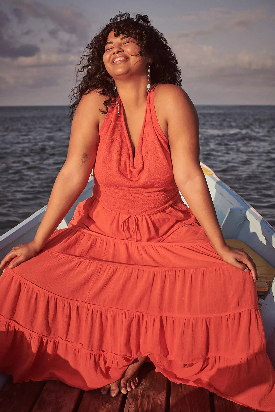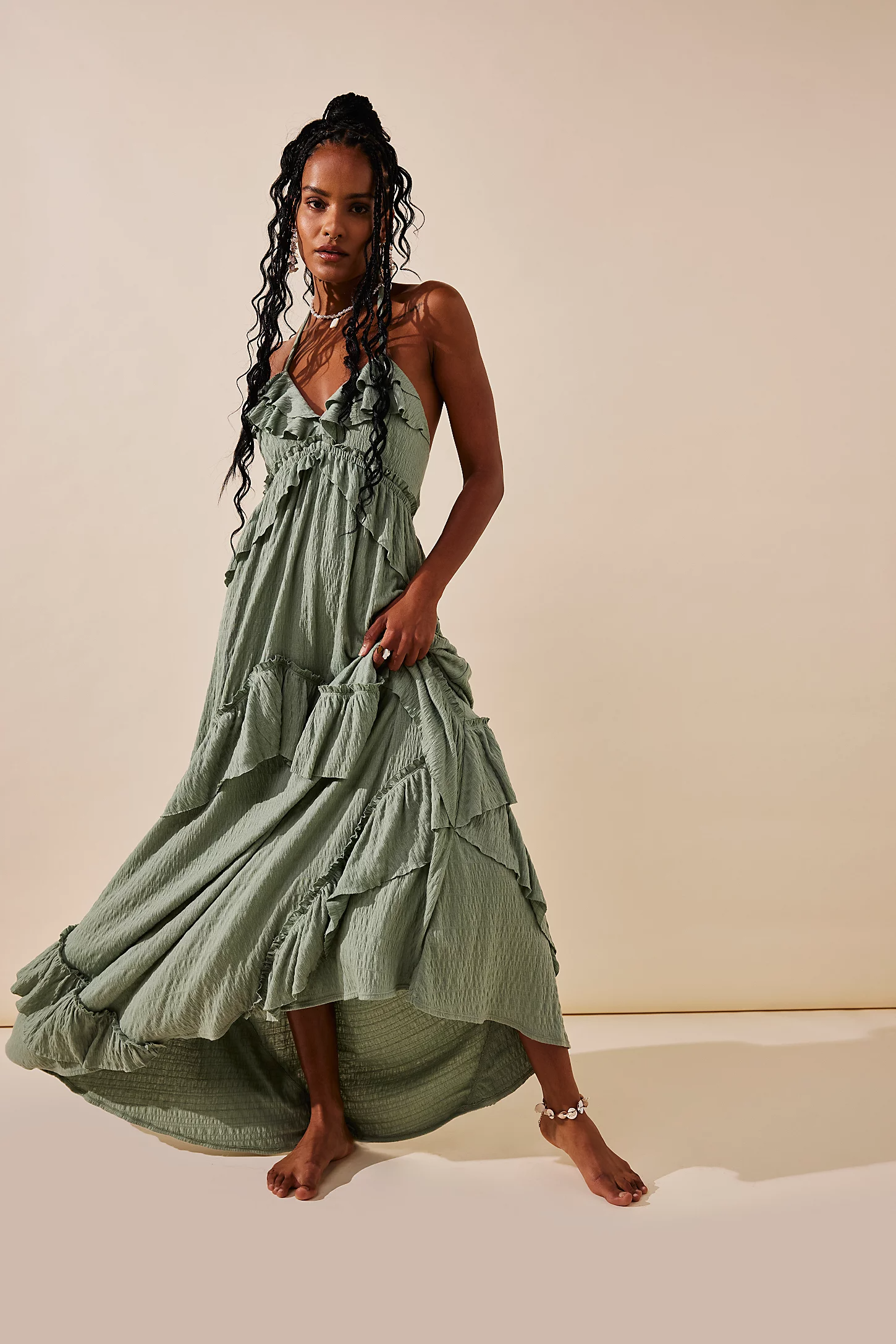 If you’re in the market for a super flowy and ethereal tiered dress, you’ll love this new style. The textured and ruffle-forward maxi is delicate and features an open back with adjustable ties. Pair it with sandals and wear your dress seaside as it billows in the breeze.