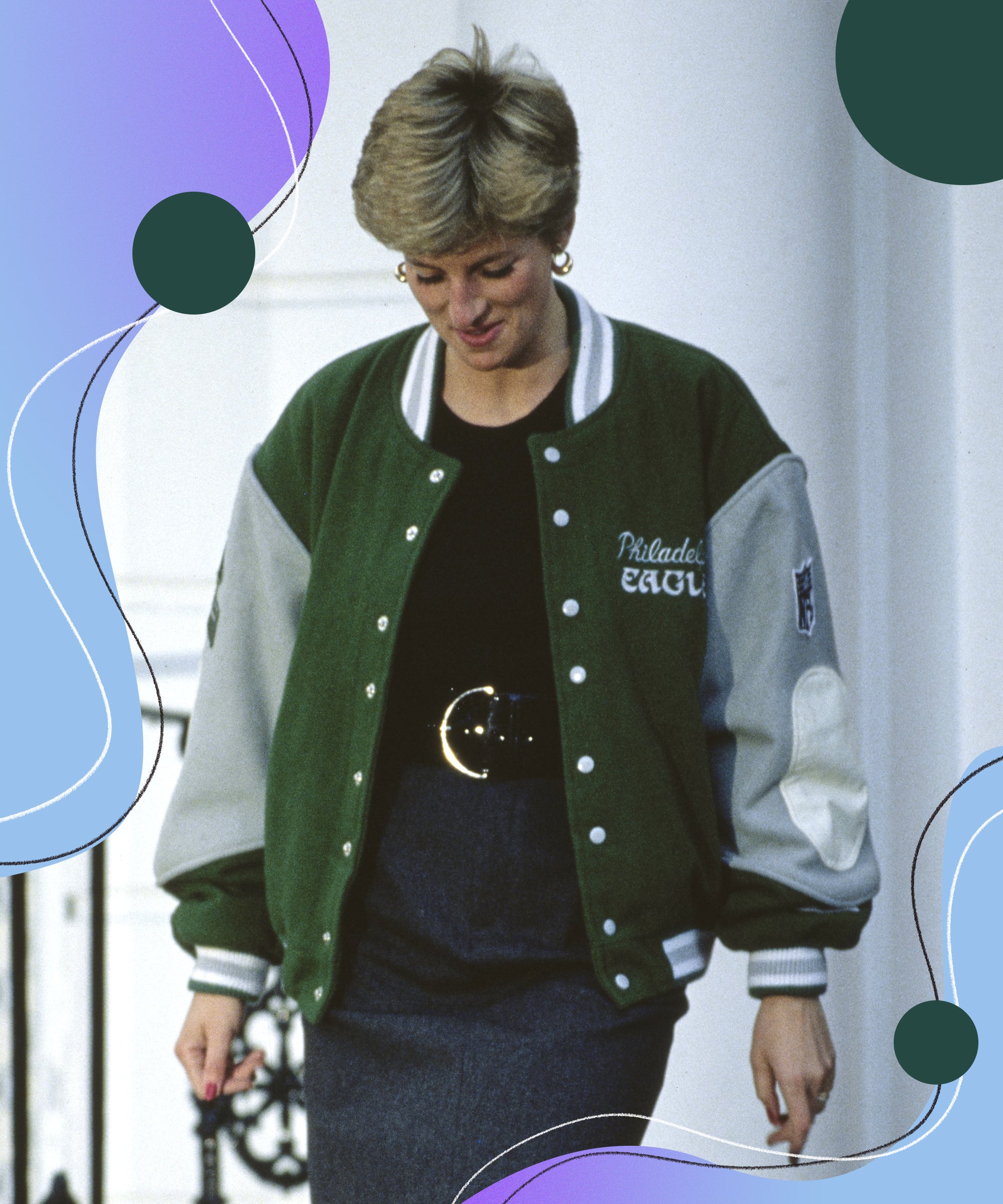 The return of varsity jackets en vogue isn’t solely based on nostalgia — the silhouette has royal ties, too. Ever since Netflix released the fourth season of The Crown, we’ve had Princess Diana on the brain, seeking out the truth behind her sapphire engagement ring, as well as shoppable alternatives to her best fashion moments. A pioneer of the varsity aesthetic for adults, Diana wore her fair share of collegiate crewnecks, baseball caps, and bike shorts. In 2019, Hailey Bieber recreated many of the late princess’s most famous sportswear looks in a shoot for Vogue Paris. But Diana’s most casual (and coveted) look has yet to make it on the show, nor was it incorporated into Bieber’s shoot. The item? Her green-and-silver Philadelphia Eagles varsity jacket that she debuted in 1991 before recycling it three years later.
