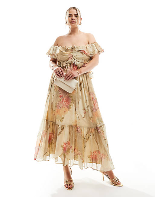 Asos Design Curve Floral Ruffle Off The Shoulder Midi Dress