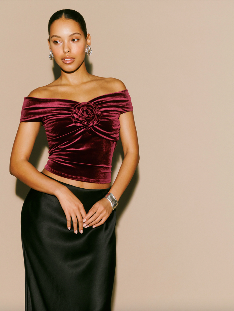 Reformation’s sweetheart tops and tees are on sale, and we’ve included our favorites, like a festive ruched velvet off-the-shoulder knit top and a drapey blouse with white heart motifs.