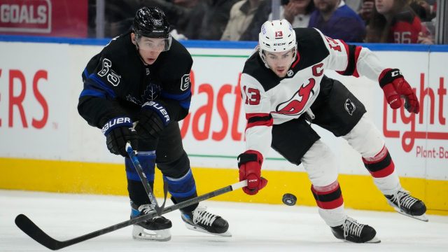 Comb through the footage, and you’ll see No. 55 popping up with a timely play more often than not, moving pucks out of the Maple Leafs’ zone with ease, clogging up passing lanes with his stick, or stabbing at opposing players’ blades to knock pucks loose before the pass even comes. You’ll see him standing Devils up at the blue line, their intended sprints to the cage ending with the puck floating quietly to the corner, or launching his 200-pound frame at them along the boards, cutting attempts off there.