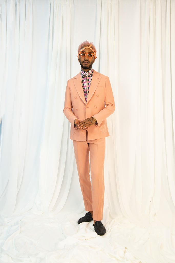 One designer that Daniel reached out to for the event was Rich Henry, or Fresh, an L.A.-based designer whose brand Richfresh is beloved by celebrities including The Weeknd, Lena Waithe, and Gabrielle Union, and known for its luxury suiting and expert tailoring. Fresh’s first NYFW collection included the label’s signature suits in bright colorways and over-the-top patterns, as well as silk robes, a new genre for the designer. Over Zoom, Fresh, dressed in one of the new robes, said that, for the collection, he explored the concept of Black luxury, and wanted to “just really show an opulent way of living.” Other standouts included silk headscarves in soft citrus colors and a yellow co-ord that combined the brand’s signature formal tailoring with the laid-back preppy aesthetic. Fresh said that it’s “surreal” to have shown for the first time at NYFW: “I’m just a kid from Memphis who said, ‘You know what? I have to try this out. I have to give this a shot.’ But I felt like there was something out there for me, and it’s fascinating to see that come to fruition.”