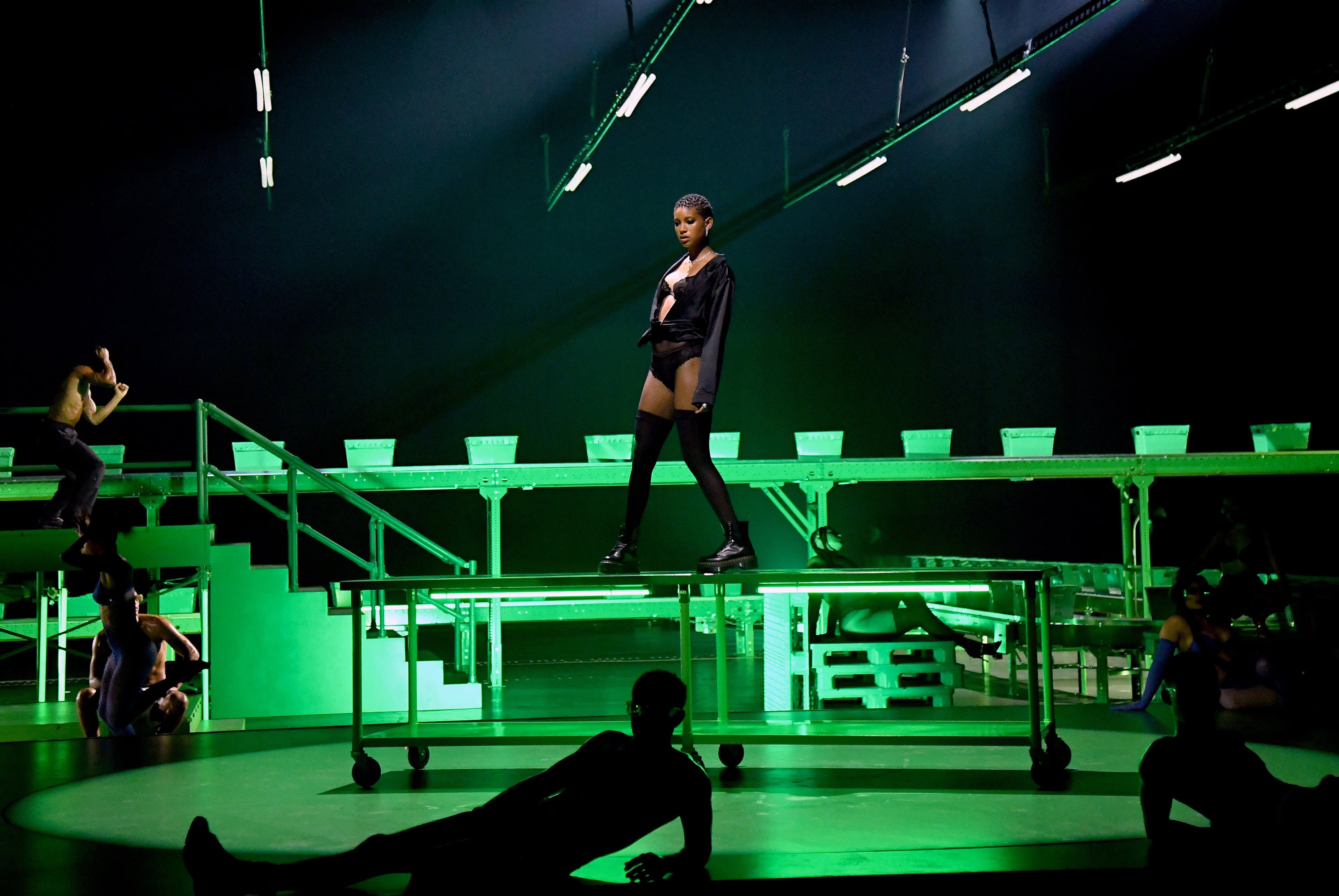 In the Garden of Eden, Hollywood actress Laura Harrier and supermodel Irina Shayk are lounging effortlessly in electric purple and hot pink ensembles, respectively. Harrier’s bra-and-underwear set is detailed with iridescent orchid petals, matching her elbow-length latex gloves and thigh-high latex socks. (Her lace-up white sandals could be the product of designer Amina Muaddi, who heads up the shoe department at Rihanna’s LVMH-backed luxury label Fenty.) Shayk’s hair is worn in a Lara Croft-esque braid, and her makeup is Euphoria-inspired. She is wearing a hot pink, lace corset clipped to matching latex thigh-highs. New Zealand-based choreographer Parris Goebel can be found in the Dear Diary room, her face painted with thin, artful lines, which featured messages written on the walls in glow-in-the-dark-paint. Underneath a chain fishnet top, Goebel has on a black bayonet bra and string bikini-style bottoms. Meanwhile, on yet another stage, “Truth Hurts” singer Lizzo shows everyone up by covering herself in diamonds. Her lingerie look? An electric blue lace bra, paired with coordinating fingerless gloves and a fishnet bodysuit. Her nails, of course, a perfect match.