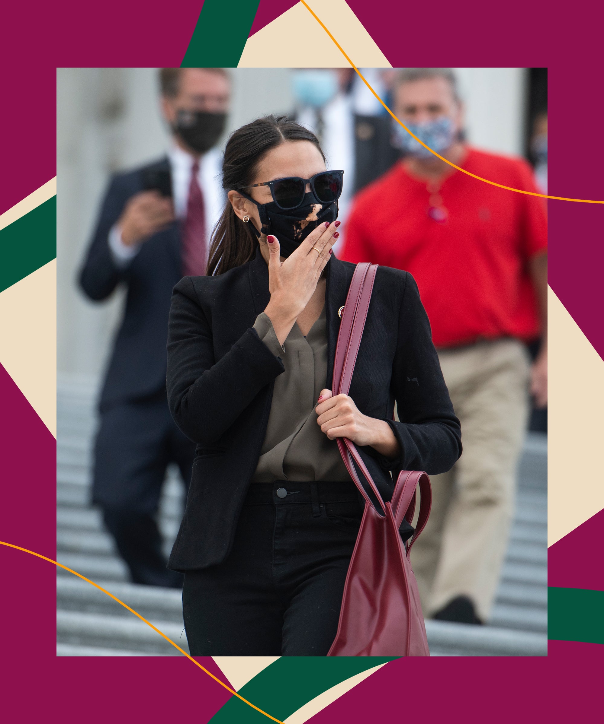 Just two days later, on Saturday, AOC was spotted wearing a bleach tie-dye face mask, black skinny jeans, and a fitted black blazer outside of the Capitol building in Washington, D.C. Even better than her on-trend mask was the bag she had slung over her left shoulder: a medium-sized Telfar Shopping Bag in the color oxblood, which also matched her nail polish shade.