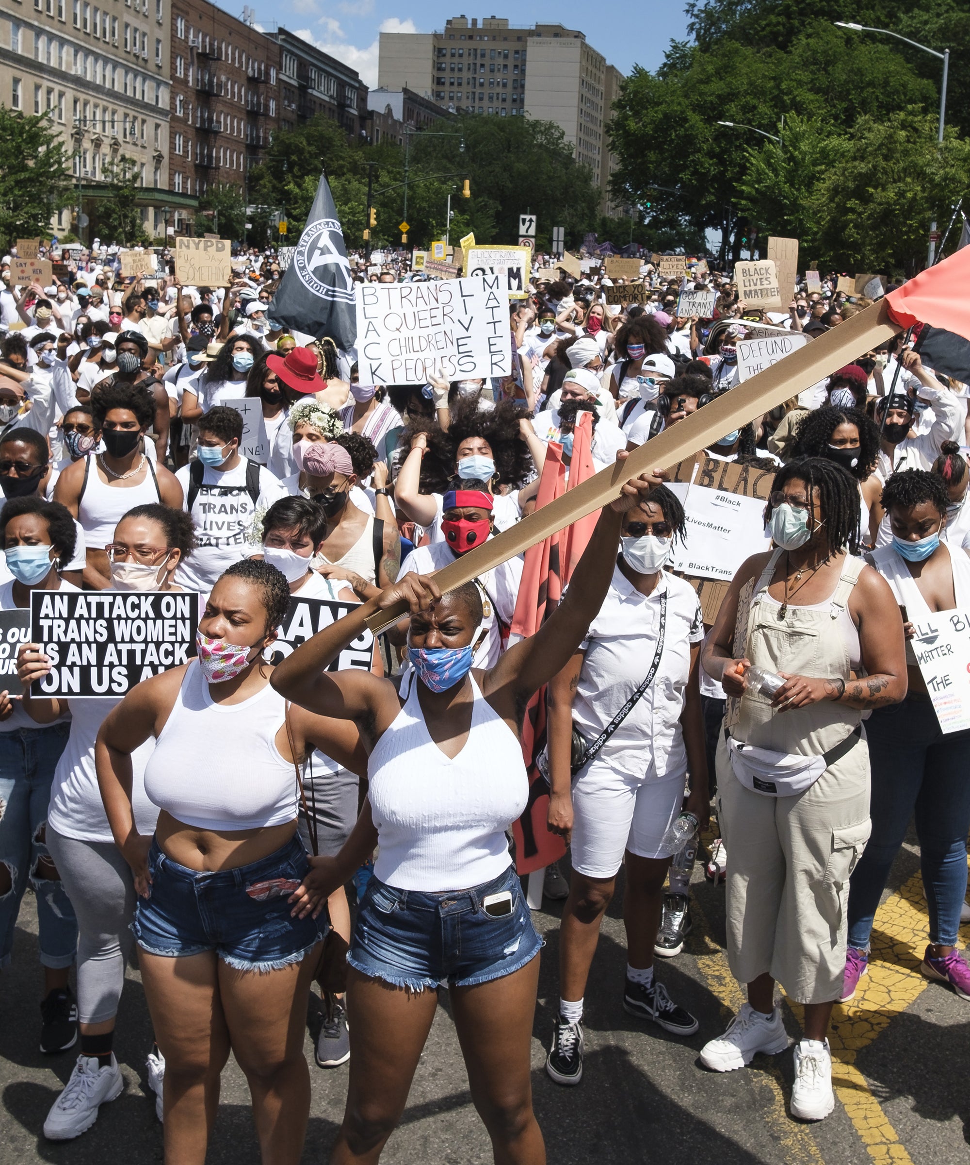 People march during a Black Trans Lives Matter protest as part of the larger public response against police brutality sparked by the recent death of George Floyd, an African-American man who was killed last month while in the custody of the Minneapolis police, in front of the Brooklyn Museum in Brooklyn, New York, USA, 14 June 2020. There have been wide spread protests following Floyd’s death, which was captured in a cell phone video where a police officer, who has now been charged with murder, is seen kneeling on Floyd’s neck while he can be heard saying ‘I can’t breathe’.