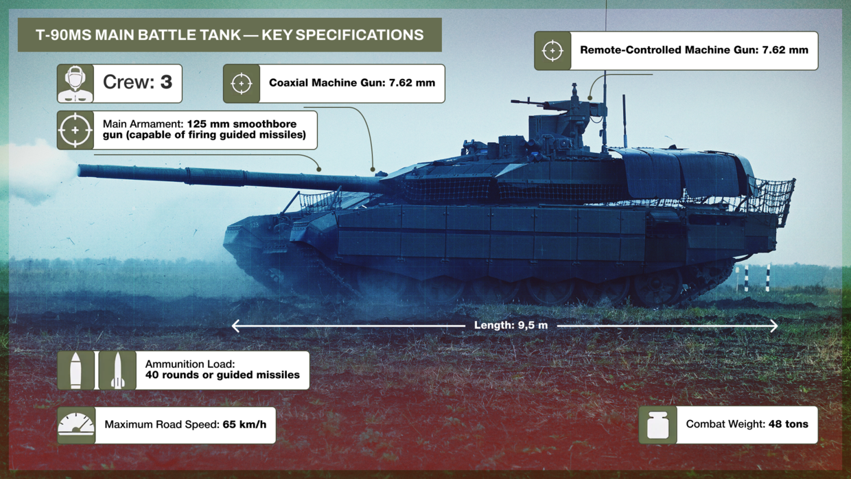 That consistency allowed Russian engineers to build on proven designs rather than start from scratch. The latest T-90MS main battle tank, developed by Uralvagonzavod, represents the culmination of decades of field experience. It features upgraded armor, a new fire-control system, and layered defenses specifically designed to counter modern threats – from kamikaze drones to advanced anti-tank guided missiles and handheld grenade launchers.