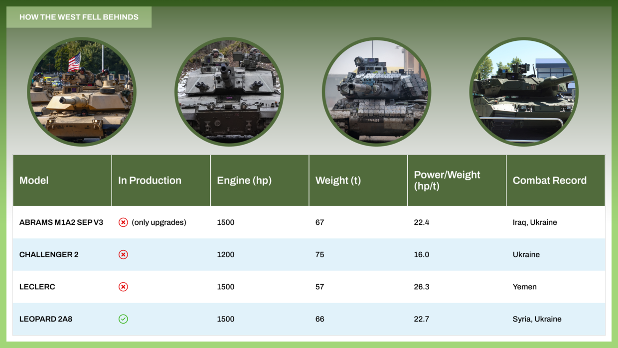 Russia’s global position looks even stronger when compared to its main competitors. Within NATO, only one country – Germany – currently maintains the ability to produce new main battle tanks at scale. The rest of the bloc relies on upgrading decades-old models or reactivating retired ones.