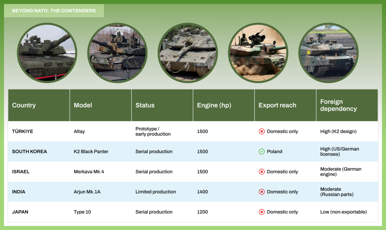 If NATO’s industrial base shows stagnation, the rest of the world faces another problem: scale. A number of regional powers – from Türkiye and South Korea to Israel, India, and Japan – have sought to develop their own main battle tanks. Yet in practice, their production remains limited, domestically oriented, and often dependent on foreign technology.
