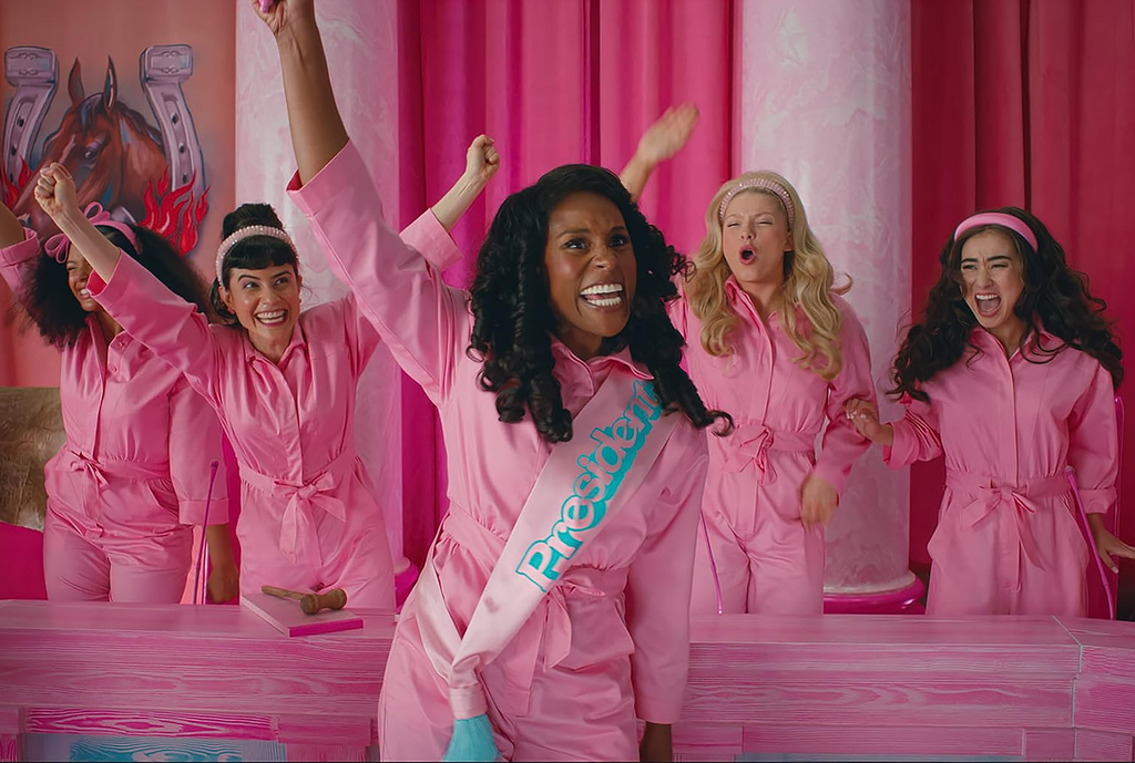 President Barbie, played by Issa Rae, has already become a collector’s doll from Mattel, thanks in no small part to her stunning costume. Her signature look is defined by a blush and gold ballgown, accompanied by a President Barbie sash, and a chunky rhinestone and gold necklace. Grab an official pink folder and pink feather quill pen for extra accessories.