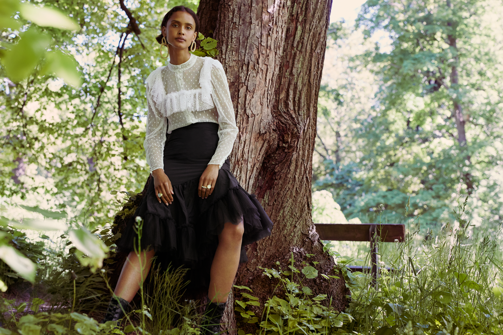 For the campaign, the Fleur du Soleil collection was photographed in a fairytale-like forest setting. “The first things you notice about Mansour’s designs are their dreamy qualities and sheer beauty, but then you get further drawn into the craftsmanship, the storytelling, and the modern youthfulness,” says Maria Ostbom, H&M’s Head of Womenswear Design. “There’s also something empowering about the femininity.”