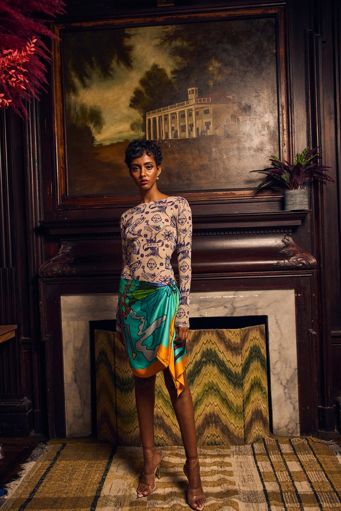 The brand, which has operated on a made-to-order basis and utilizes organic fabrics to reduce its carbon footprint since its founding in 2013, has long used archival research and personal storytelling to inform its designs. In 2017, with the launch of their collection “Bloodroot,” inspired by their Southern heritage and the post-Antebellum period, the two created an online platform for users to share their own personal and familial stories through folktales, quotes, and sayings. This dedication to looking to the past to create uniquely modern apparel has led House of Aama to become one of 10 CFDA/Vogue Fashion Fund finalists, alongside brands like Batsheva, Hanifa, Eckhaus Latta, and Willy Chavarría.