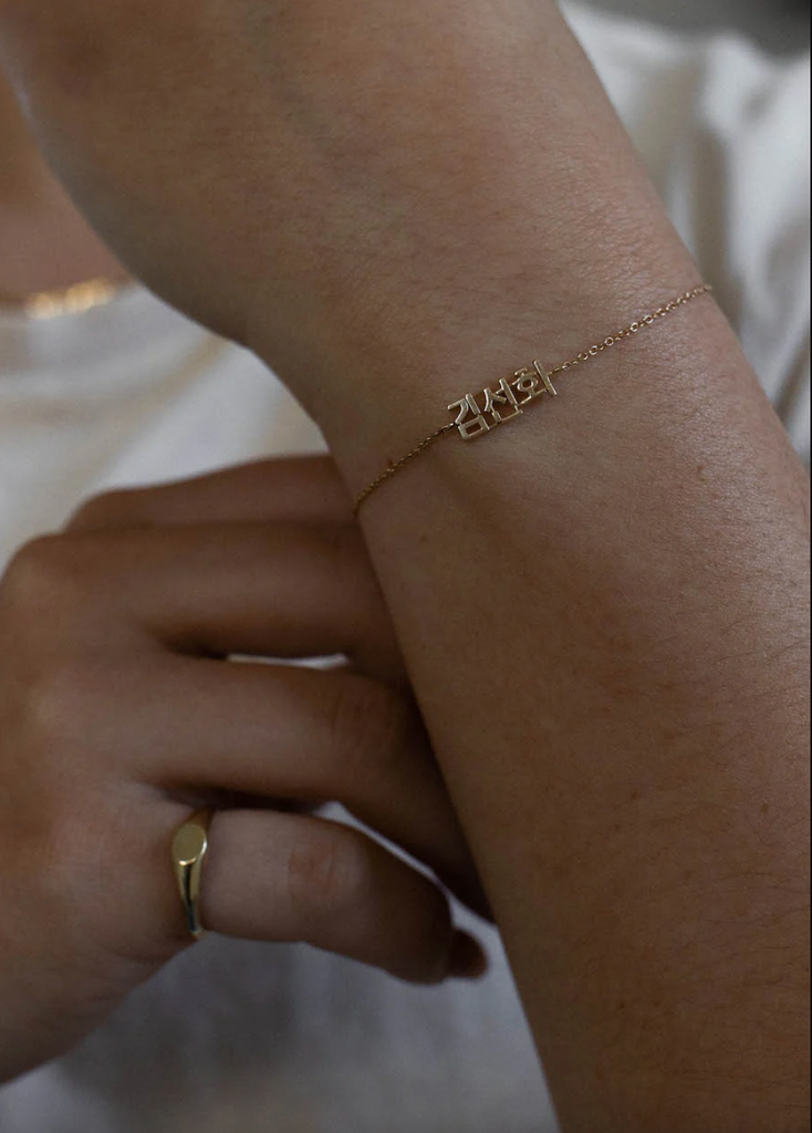 Within Kinn’s intricate jewelry collection, there’s a nameplate collection called Dear Kaia. The first two, Dear Kaia Initial Necklace and Dear Kaia II Nameplate Necklace, are steered towards English names. Growing up, I secretly envied those who could get their names in adorable nameplate necklaces. I’d see fashion influencers, celebrities, and girls in classes throughout high school and college wearing necklaces with their names in cute loopy, bedazzled scripts. Finding my Korean name in a necklace was already a non-starter, but I could also never find a nameplate with the correct spelling of my American name, either. While I recently was gifted one with “Vivien,” I never thought there’d ever be a time when it’d be possible with my Korean name. Kinn changed it all.