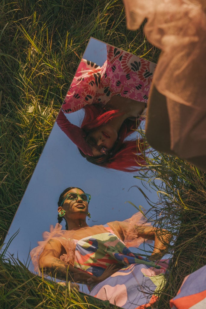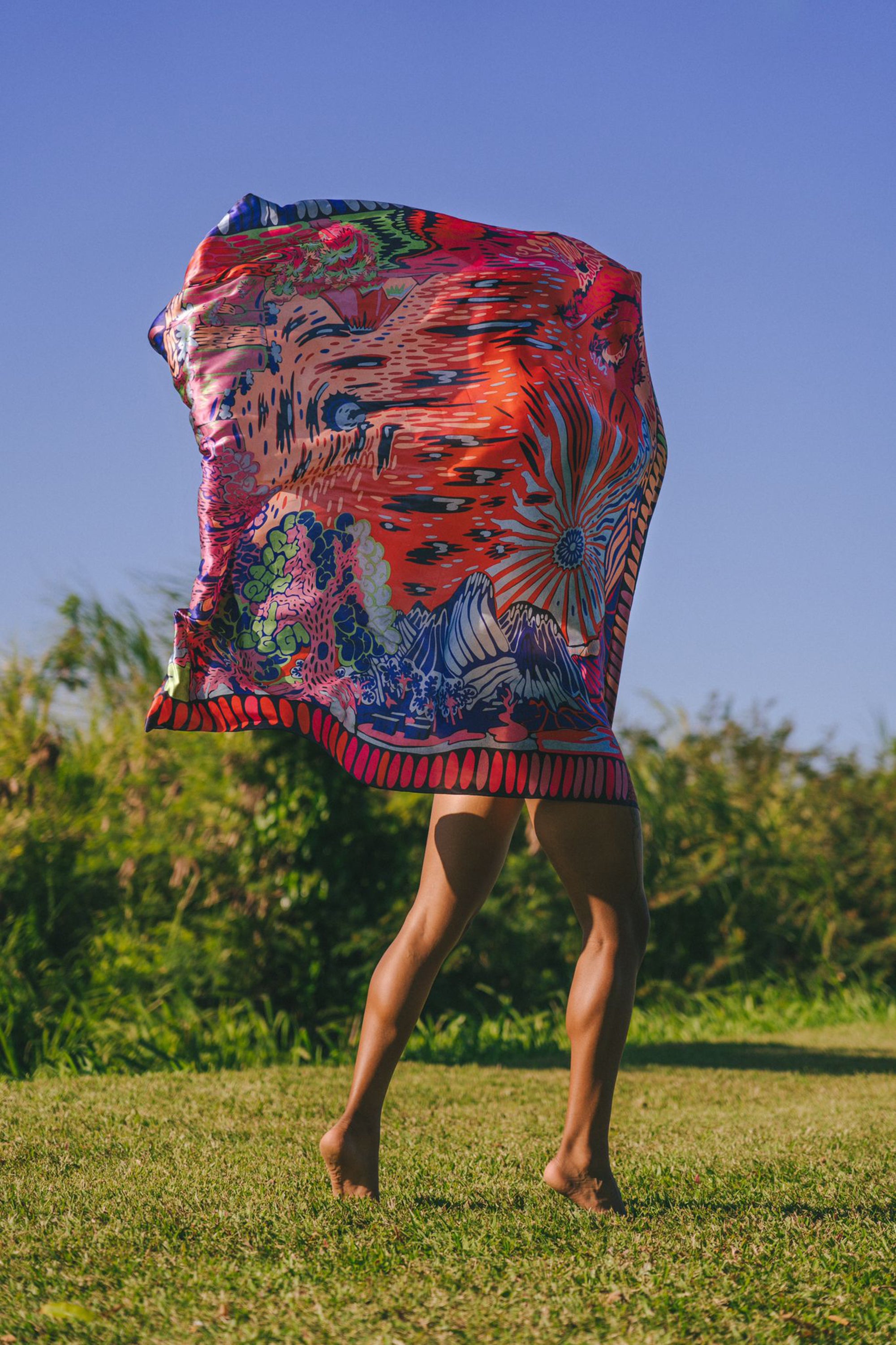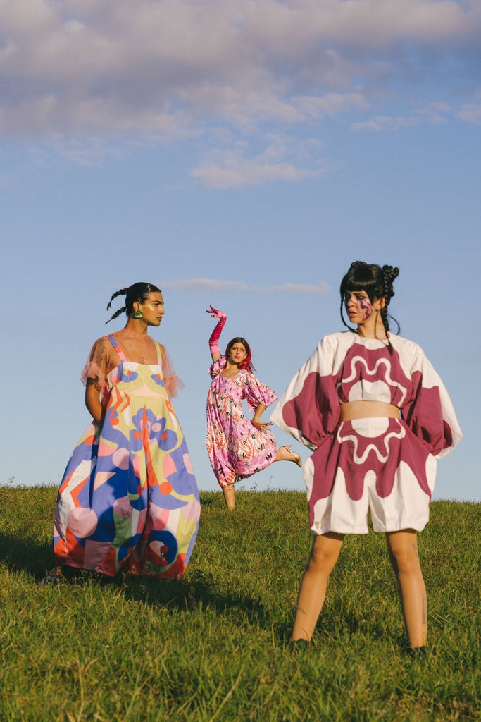 The eight-piece line — which includes a dress, a puff-sleeve top, a jumpsuit, a pair of high-waisted shorts, and three scarves — features Forastieri’s signature bold prints, including abstract geometrical shapes and psychedelic flowers, which are drawn by hand. Each garment is also named after an element of Forastieri’s brand mission: For example, the “Cuerpa” jumpsuit references a term queer communities in Puerto Rico have claimed to degenderize the masculine word for body. “[The collection] has a lot to do with emotional processes with other humans and nature, as well as transformation,” the designer explains.
