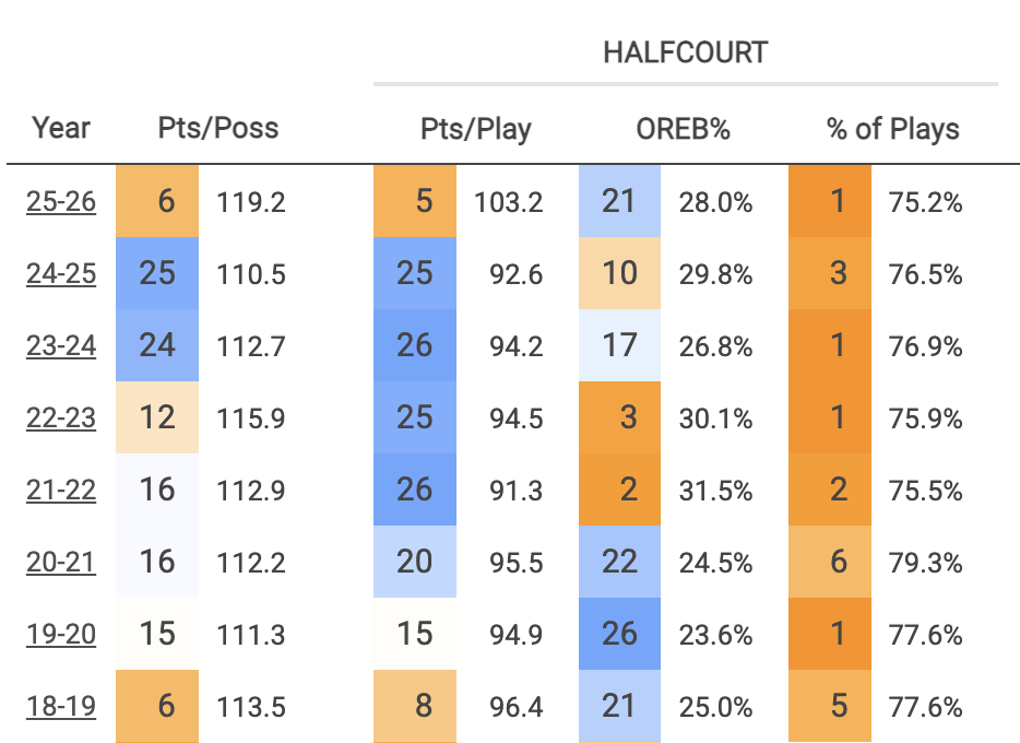 This comes into focus particularly in a halfcourt setting. Attacking against a set defence — where players are already matched up with their man and not scrambling back like in transition — has been one of the Raptors’ greatest weaknesses in recent years. They’ve ranked in the bottom six for four consecutive seasons.