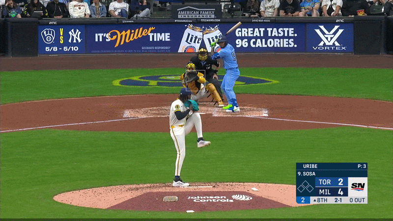 The difference was Sosa’s ability to get bat to ball. His MLB whiff rate is over 10 points lower than Valenzuela’s minor-league one against lesser pitchers. Meanwhile, Uribe’s frisbee slider and running sinker average two feet of movement spread horizontally across the zone. It takes a very adjustable swing to cover that much plate. Which is exactly what Sosa did, getting a look at a couple of Uribe sliders and a sinker before inside-outing a 99-m.p.h. heater on the inner half and dumping it into shallow centre field.