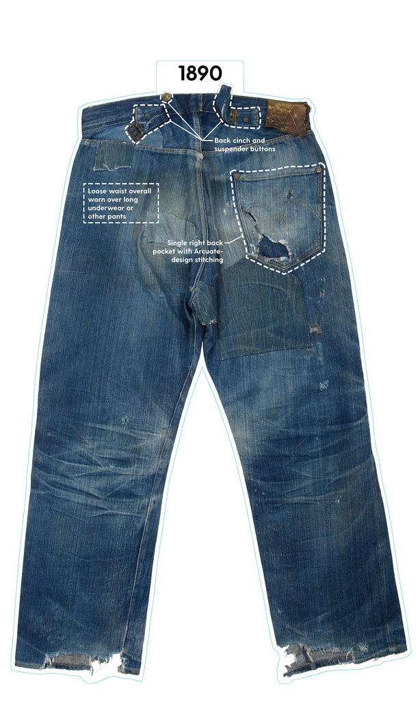 Known for its button fly and a wide variety of fits, which range from the original straight-leg model to ’90s-style and skinny jeans, the 501s were first designed as “waist overalls,” featuring buttons, as well as a back cinch, for customers — primarily working men — to hook their suspenders. “It was a protective outer garment, and it was originally intended for blue-collar workers who needed tough work products,” says Panek. The original patent for this design was granted to Levi Strauss — the founder of Levi’s — in 1873, yet it wasn’t until 1890 when the lot number “501” started to be used to refer to the model. Subtle changes soon followed: In 1901, two pockets were added; belt loops were tacked on in 1922.