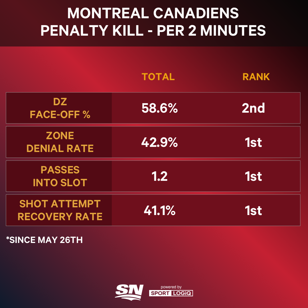 Since Game 4 of their series against the Maple Leafs, the Canadiens have allowed an average of 4.4 inner slot shots per game, which is the fewest of any team in that time. Montreal has also allowed the fewest slot shots and rebound scoring chances.
