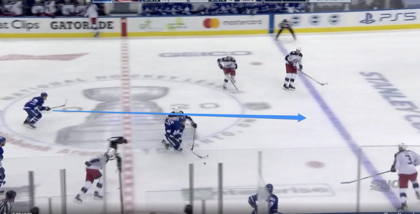 Similarly, Tavares is shown here driving the puck into the zone, but he’s on his backhand and moving relatively slow. For him to complete a pass to Mikheyev in the middle would be a prayer.