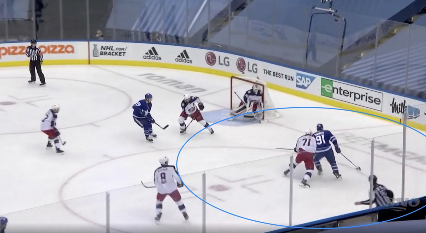 That sequence above starts with the below, where Matthews is alone against two Columbus defenders, and Hyman is in a really good soft spot. I say good because if Matthews can beat two guys, boy, Hyman is laughing. But Columbus defends too well and these hopeful positions without the puck just didn’t pan out in Game 1.