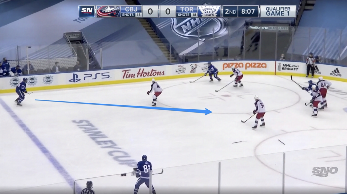 That decision is likely a stick-less winger hauling down a dangerous player and taking a penalty. Instead, the Leafs stay to the outside, allowing Columbus to remain in reasonably tight structure, with no short passing support in sight.