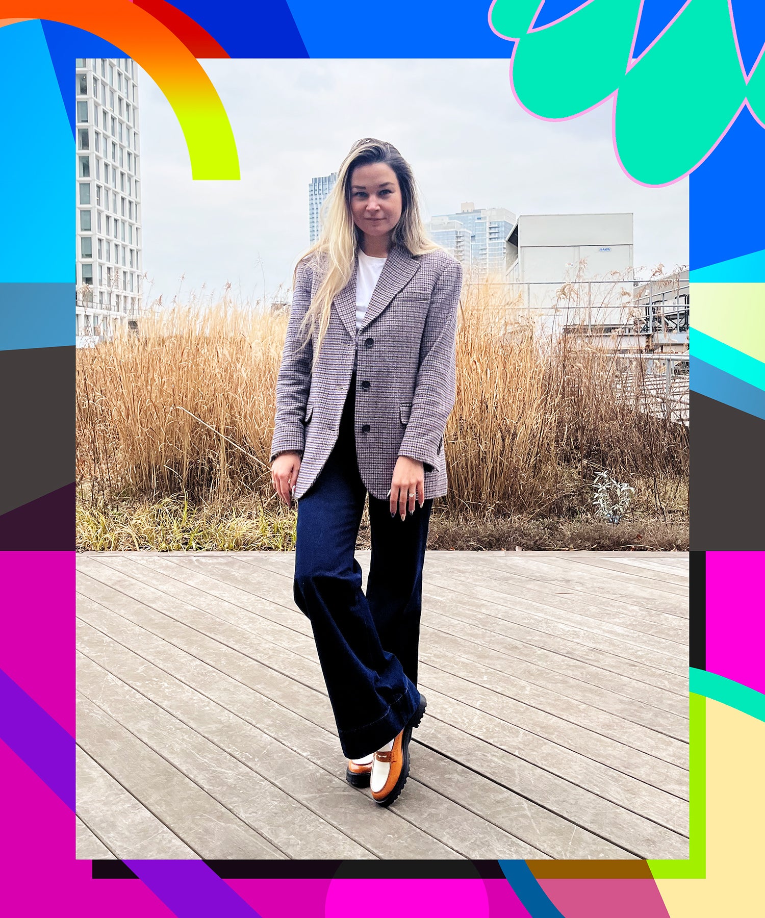 “I’m fairly new to loafers (I got my first pair a few months ago) and these made me excited to continue wearing this classic style for years to come. I love that they look super elegant, yet modern, thanks to the chunky sole. I’ll say that, while I’m now a loafers fan, it does take a bit for the shoes to break in (I got some blisters even wearing band-aids and socks). In terms of styling, I decided to pull inspiration from the loafers’ two-tone hue, pairing them with pinstripe wide-leg pants that made me look like an ‘80s banker, and a simple black blazer. I totally get why celebs and fashion fans alike are all over these loafers: they’re affordable, easy to style, and made to last season after season, no matter the trends.”