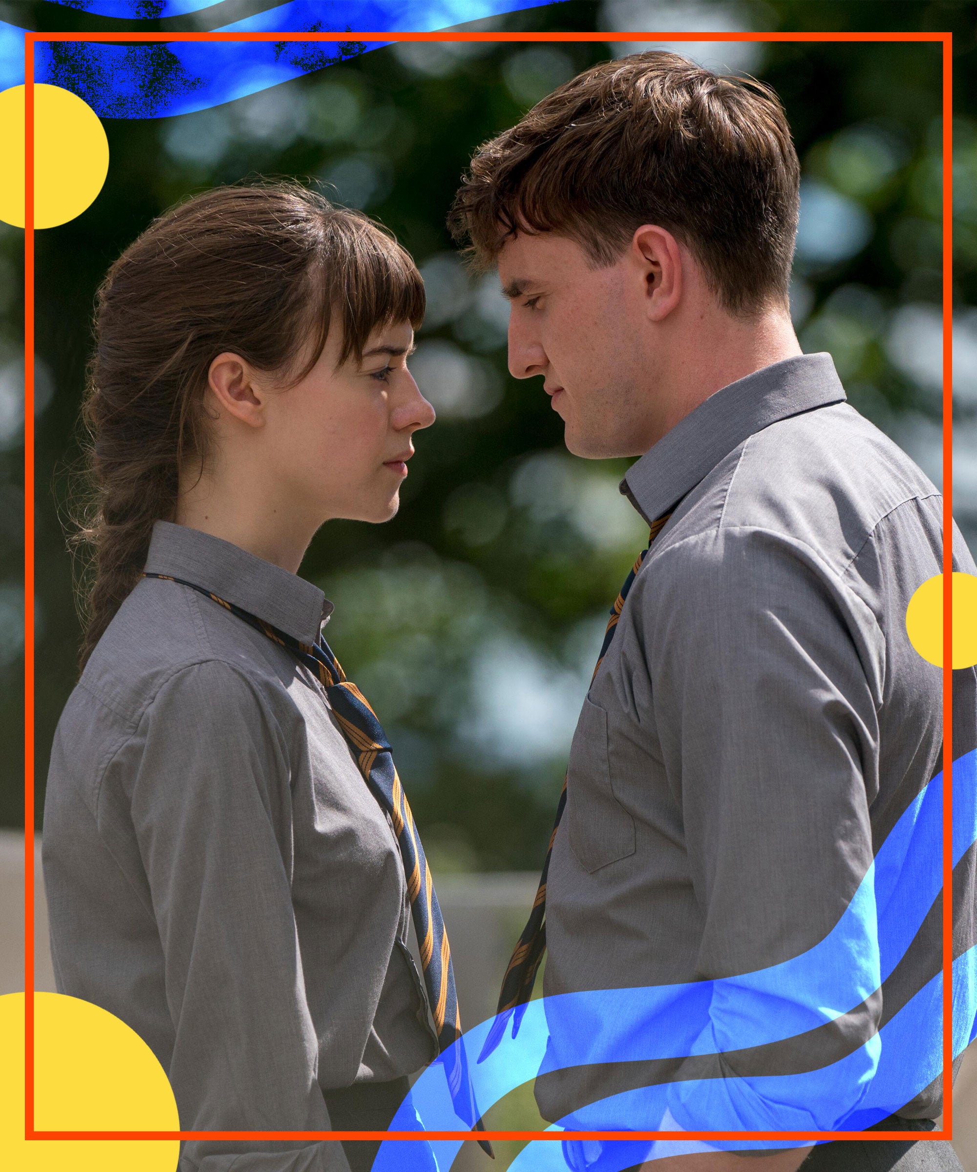 In the show, Connell (played by Paul Mescal) and Marianne (Daisy Edgar-Jones) meet in high school. We see them interacting for the first time in Marianne’s kitchen, Connell there to pick up his mother, a house cleaner for Marianne’s family. She’s in her natural habitat, sitting effortlessly on the kitchen counter, legs swinging, a spoon of ice cream hanging out of her mouth. “Do you want some?” she asks him. He awkwardly responds, “No thanks.” In the scene, both are wearing their cement gray uniform button-downs and navy-and-orange-striped neckties.