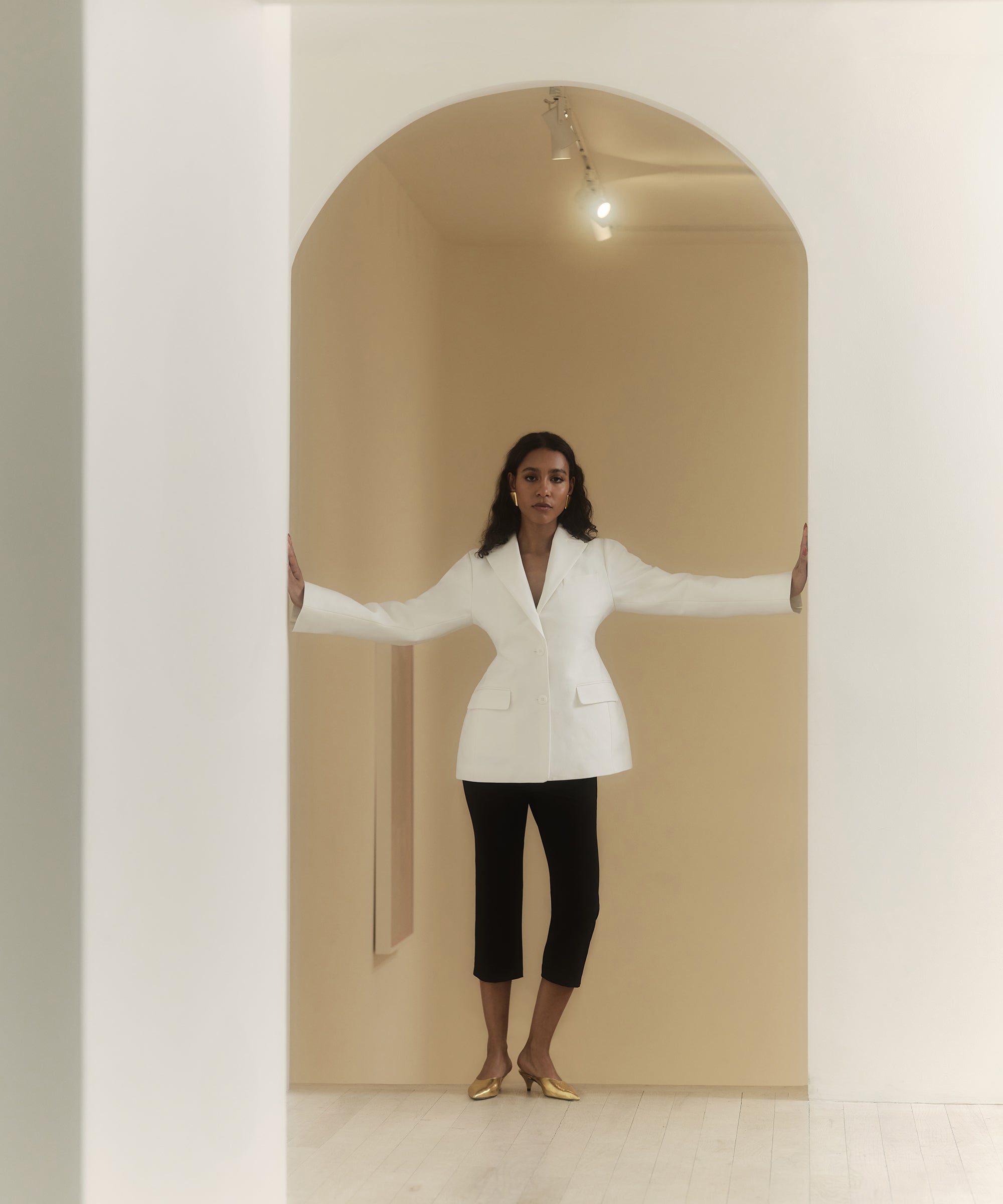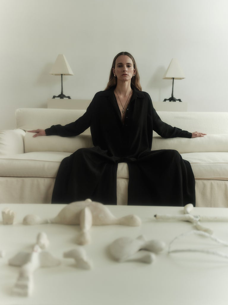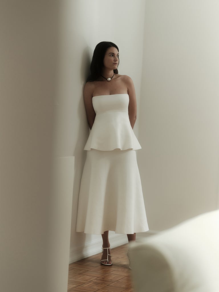 The 15-piece collection features pieces that would look just as good in a workplace as a party environment: a cinched blazer paired with, yes, capri pants; an elegant peplum top styled with a silky midi skirt; and a sheer button-down-skirt set — all in a neutral color palette. “Moda Operandi is curating fashion to empower women and their lifestyles, so it was a natural fit,” says Drevet. Timed to coincide with the Frieze New York art fair, the collection’s campaign featured gallerists Hannah Traore and Emma Scully and artist Simone Bodmer-Turner.