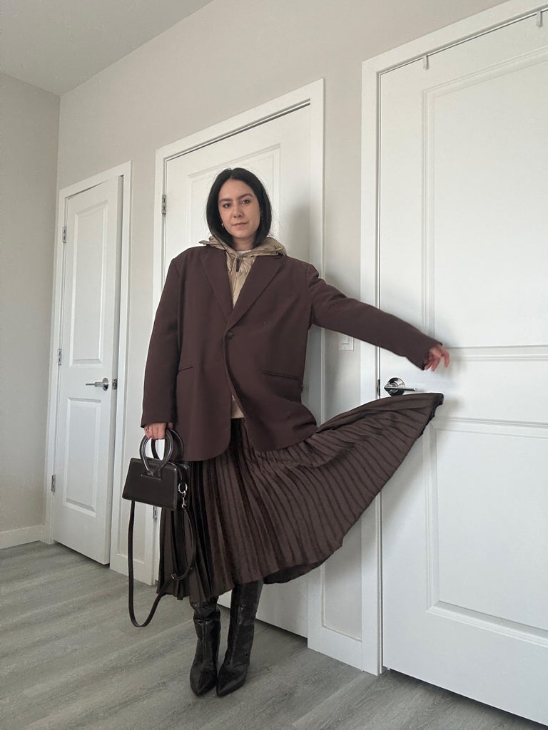 People have long worn hoodies under blazers; why not use a puffer as a layering piece, too? Granted this needs to meet a few criteria: Your puffer needs to be hooded and thin, while the blazer has to be extra oversized. The buttoned blazer adds an elevated twist to an otherwise sporty outfit that can be worn with jeans or even a skirt, as shown above.
