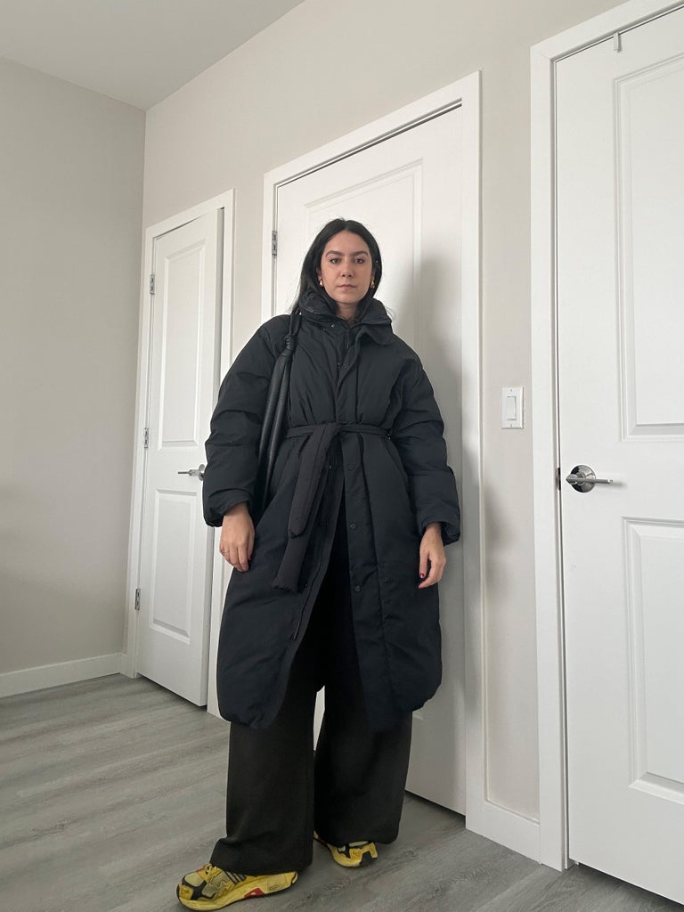 I reach for my puffer coat when the cold-weather sartorial fog hits so hard I can’t be bothered with styling an outfit. And that is okay. Moments like these are ideal for leaning into the sporty nature of the puffer coat. To tune up the outfit, I added a tailored wide-leg pant, giving a nice contrast to the sneakers, as well as a leather slouchy bag.