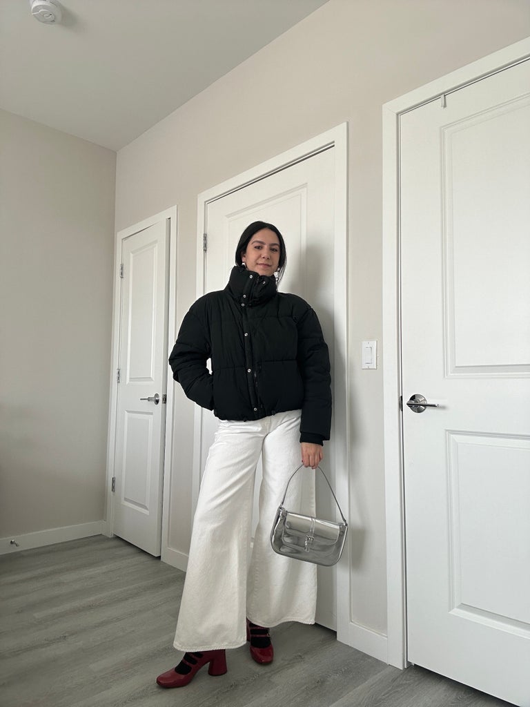 Wide-leg jeans are one of the year’s biggest denim trends, and the perfect piece to balance out the Michelin Man-level of volume that comes with a puffer jacket. For this outfit, I opted for a white pair, making the black-and-white combo a good canvas for a pop of color in the form of Mary Jane heels. A key part of this styling tip is to not be afraid of volume on the jeans — the wider, the better.