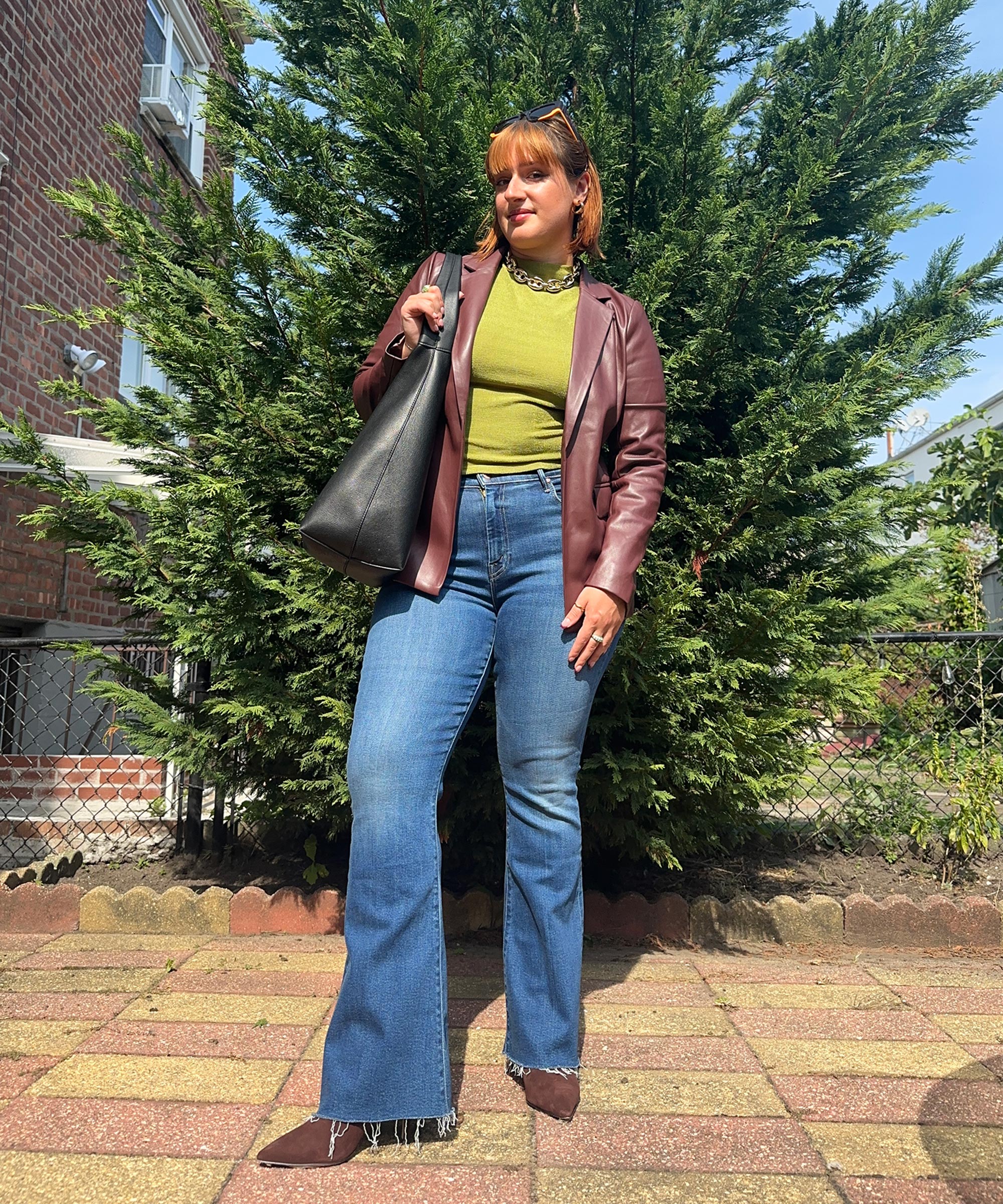 These comfortable and flattering frayed jeans may be my favorite Mother Denim style of the bunch, so I was really excited to style them. From a red-brown blazer and leather work bag to a Brat green high-neck top and suede pointed booties, I picked vintage-inspired fabrics, color palettes, and styles that complimented the denim and felt modern when combined all together. If you also plan on wearing denim to the office this fall, make sure to pair your dark-wash flare jeans with high-quality investment pieces that will elevate your look and have you feeling chic and confident.