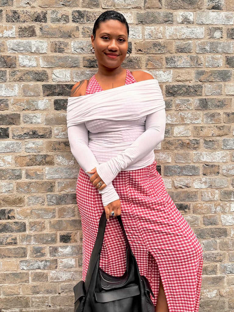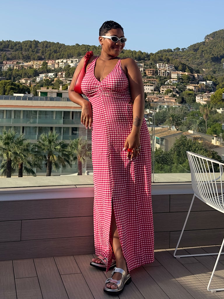 To style my red gingham maxi dress for busy (and chilly) London this spring, I’ll layer it with a more casual top or leather jacket, along with a pair of sneakers or boots. When I want my gingham to make a statement on its own (and the weather’s warm enough) I’ll wear it solo.