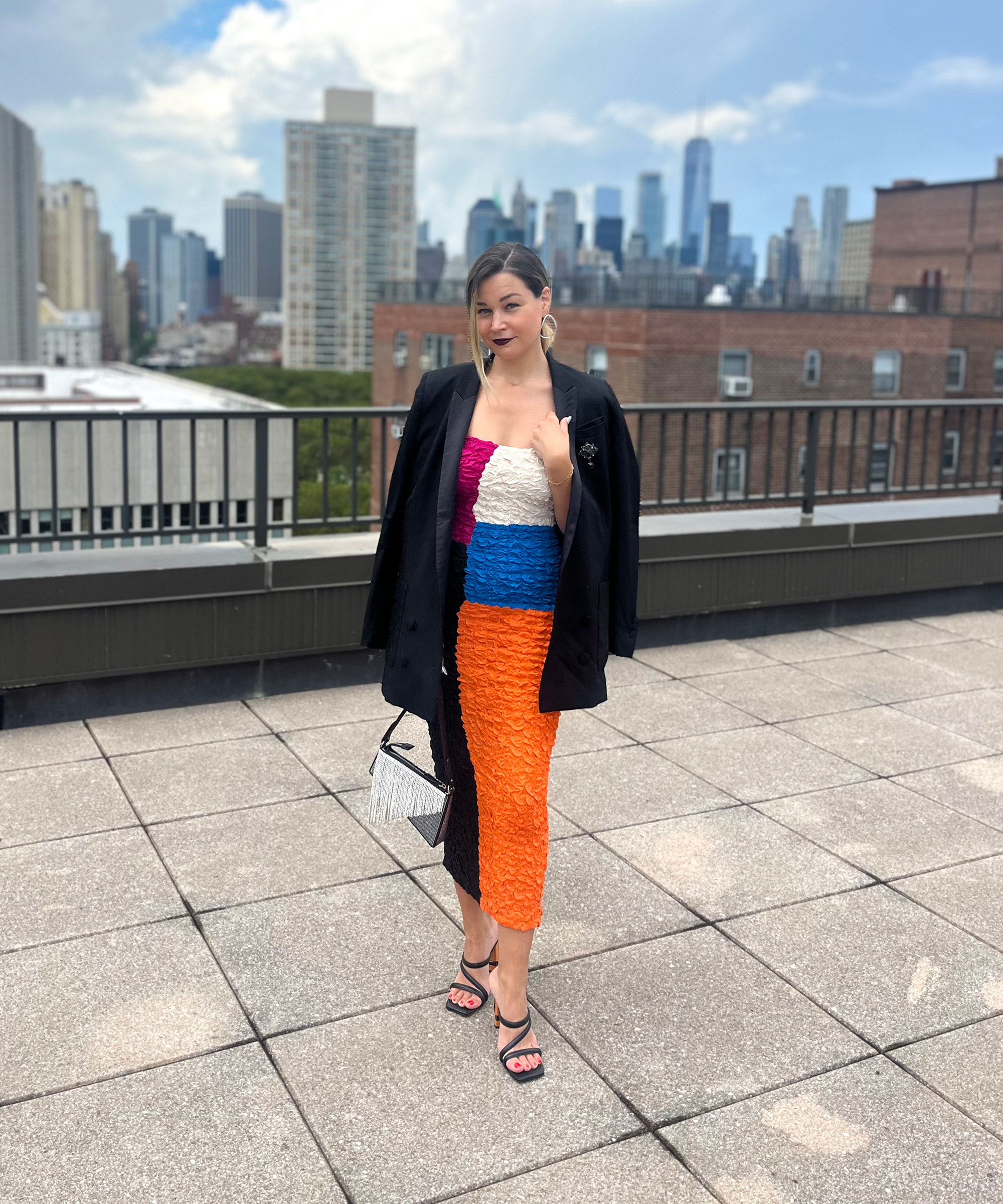 To elevate the look for a more formal affair, keep the dress the sole color focal point and round out with solid-colored pieces. To keep the all-black accessories from looking boring, I went for ones with interesting details, like a tuxedo-style blazer with silky lapels (see top photo), a handbag with crystal fringe, and heeled sandals featuring a taxi-shaped heel.