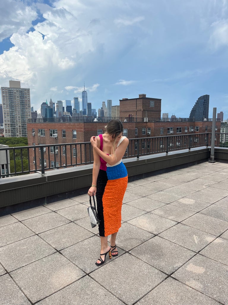 For a beach wedding, play up the fun factor of the Mara Hoffman bodycon popcorn midi by adding thematically appropriate accessories. Think: a raffia bag and platform flip-flops, both from the Mango x Simon Miller collaboration, maritime-inspired jewelry, and summertime extras like printed bandanas, anklets, and sunnies.