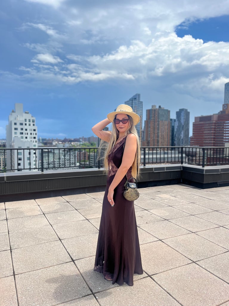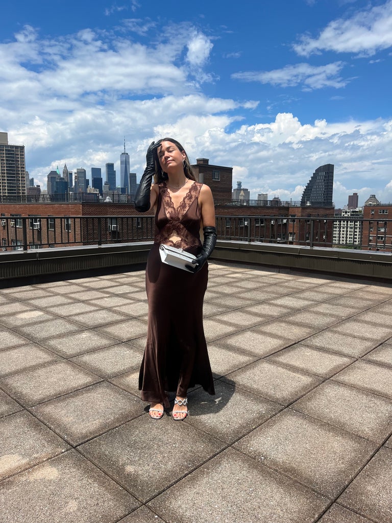 To tone down a silk dress like Sir’s popular Aries gown for, say, a barn wedding, enlist casual-leaning accessories like a straw hat, flat sandals, and sunglasses. Rather than reaching for a clutch, opt for a more laidback style like a shoulder or bucket bag. I lined mine with a scarf to both match my hat and be used in case of a night chill.
