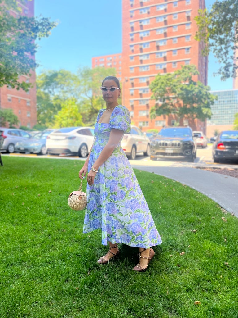 Embrace the sweetness of a floral dress for an outdoor wedding venue and double down with unabashedly feminine accessories like the trendy ballet flat, a cutesy bag, and pastel-hued sunnies. While the exact colorway of my Hill House Home dress is currently sold out, the other two botanical-inspired prints would work just as well.