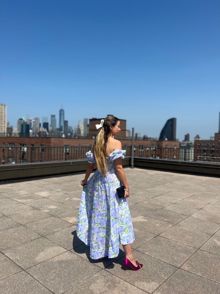 To dress up a floral look, opt for luxe materials like satin and jewel tones in the form of stilettos and a clutch. To finish the look, take a cue from Bridgerton fashion and accessorize with ribbon bows, a silky shawl, and, should the weather allow, sheer gloves. Added bonus: This dress can be worn sleeveless, which creates plenty of room to add pearl jewelry.