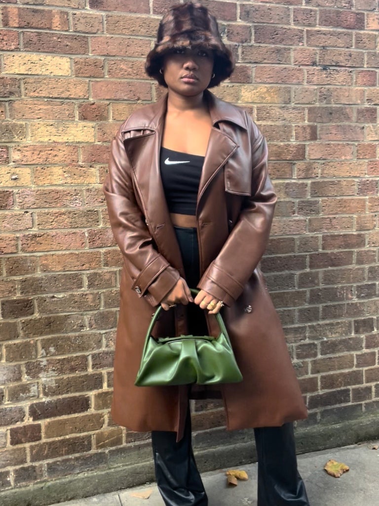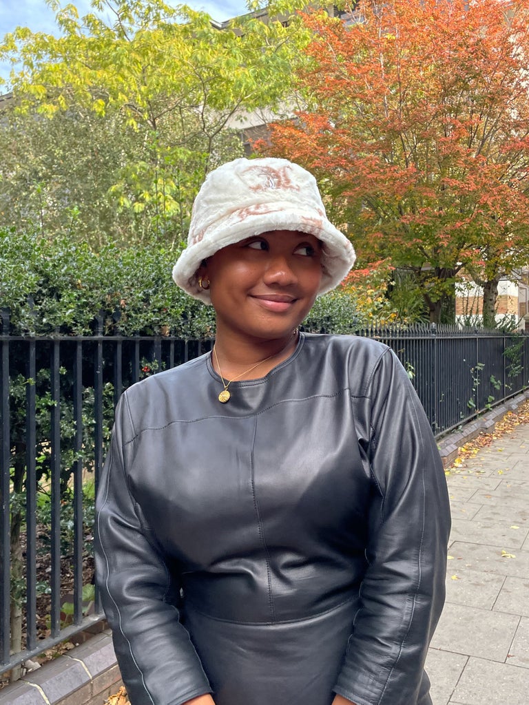 One for the Y2K girlies, the teddy bucket is the hat equivalent of moon boots or Crocs: kind of ugly but kind of cute in an unironic way. This Juicy Couture hat (also very pre-millennium) is a great addition to a wardrobe that consists of graphic tees and big silhouettes. That said, I styled it here with a contrastingly elegant leather dress for equal parts edgy and trendy. Style it down with a matching sweatsuit or a big bomber jacket and tee.