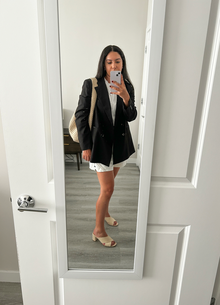 With both outfits, the key was to add the basketball shorts to my trusted outfit formulas. I’ve previously sported jeans and flowy trousers with a tank top and sandals; I have likewise worn a maxi skirt with a blazer and button-down. The result? An outfit slam dunk I will be wearing on repeat until September.