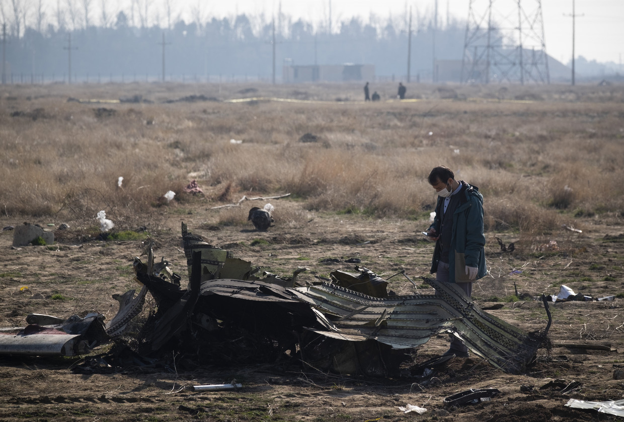 FILE PHOTO: An Iranian man stands next to wreckage from Ukraine International Airlines Flight PS752 at the site of a crash about 50 km south of Tehran. January 8, 2020,