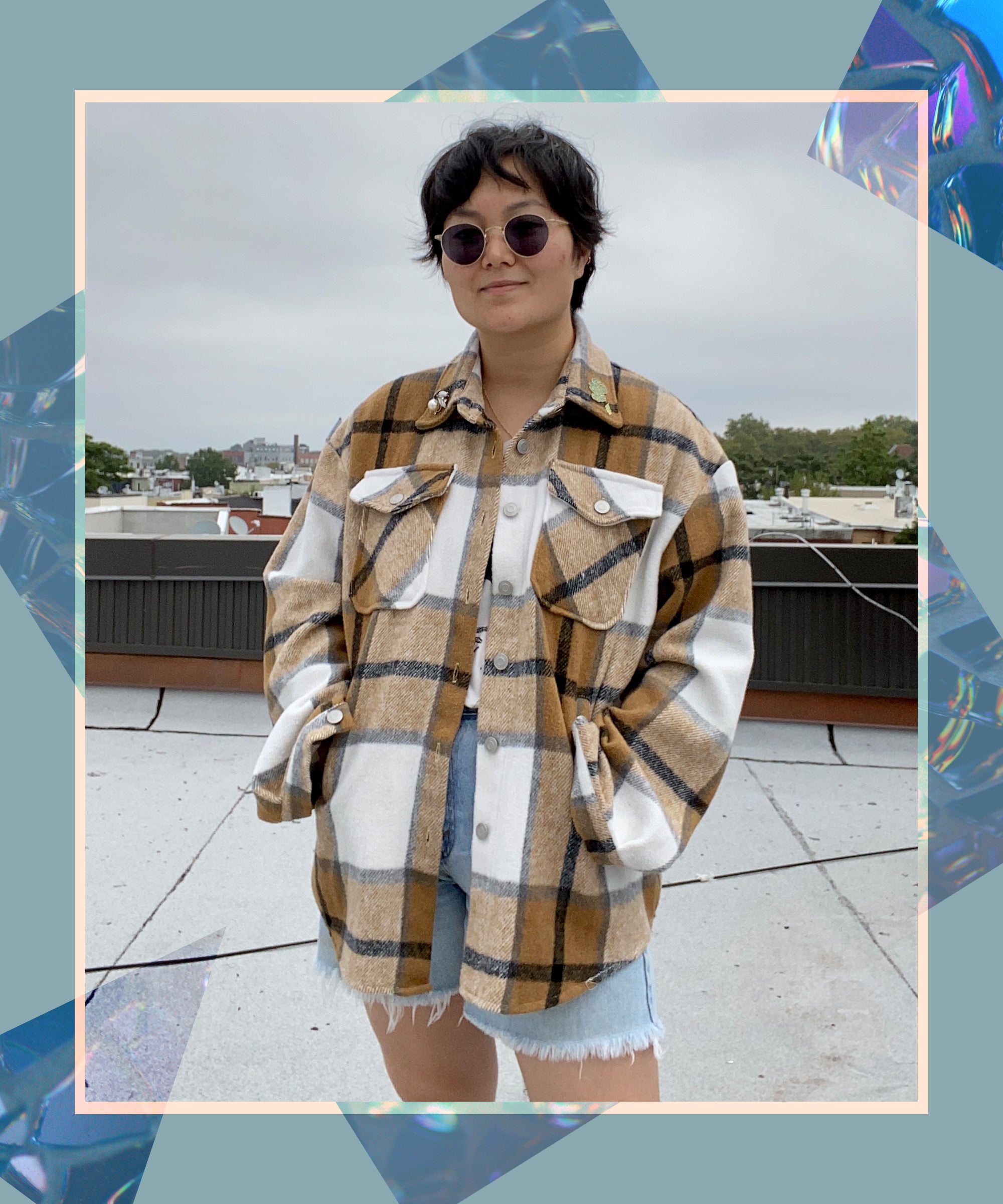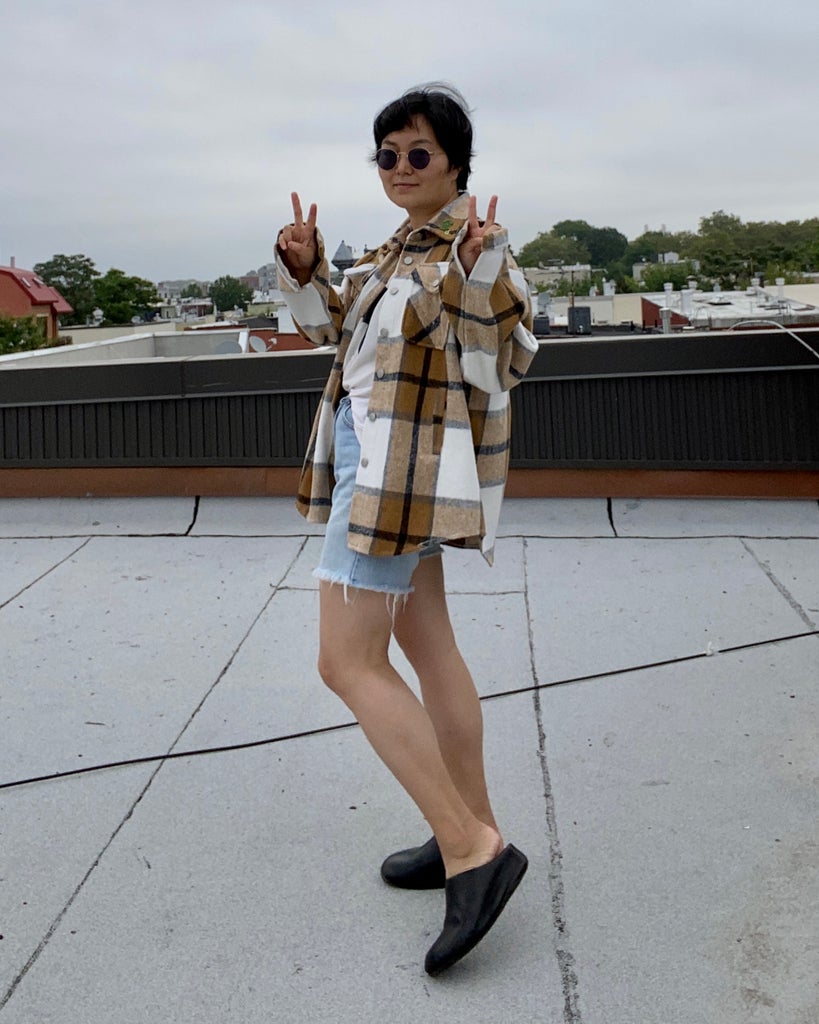 As of this week in NYC, the daytime hours can still get sweaty, but the evenings have started to cool off considerably. The shacket is fab for those 70-degree temperatures — I can throw this on over a T-shirt and shorts for a casual night out. Because it is meant to look slouchy, it contrasts especially well with cropped and tighter-fitting tops (or a bodycon dress) if you’re leaning towards a cuter, flirtier outfit. I’m more of a relaxed-fit gal in general, so I tend to go unabashedly baggy-on-baggy on top, but with shorts and clogs to keep me from looking lost under layers of fabric. The plaid print can be overpowering so I find myself going basic everywhere else — plain black or white T-shirt, classic blue jeans, and simple shoes. (I’ve also attached my own pins and brooches to the collar to personalize my shacket.) And, once it starts getting colder, I see myself wearing it with a turtleneck tucked into high-waisted jeans, or with a denim jumper or overalls. That’s a lot of options for a humble, $40 flannel jacket/shirt hybrid!