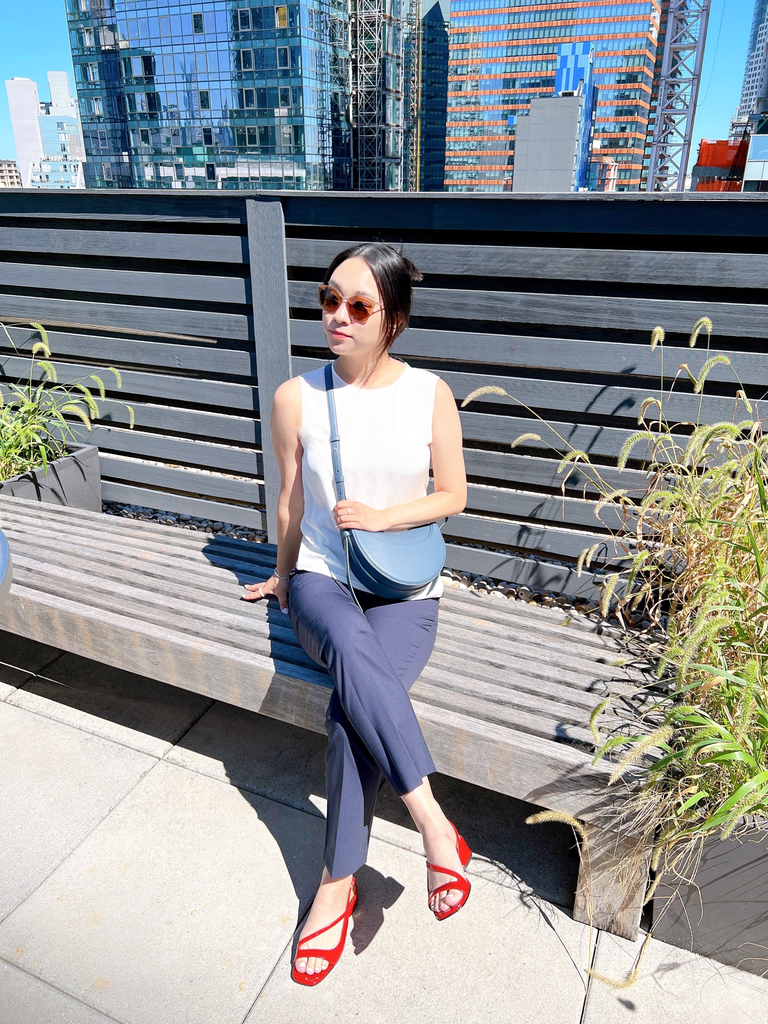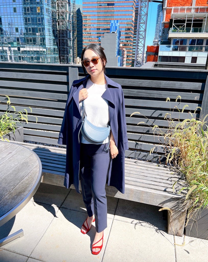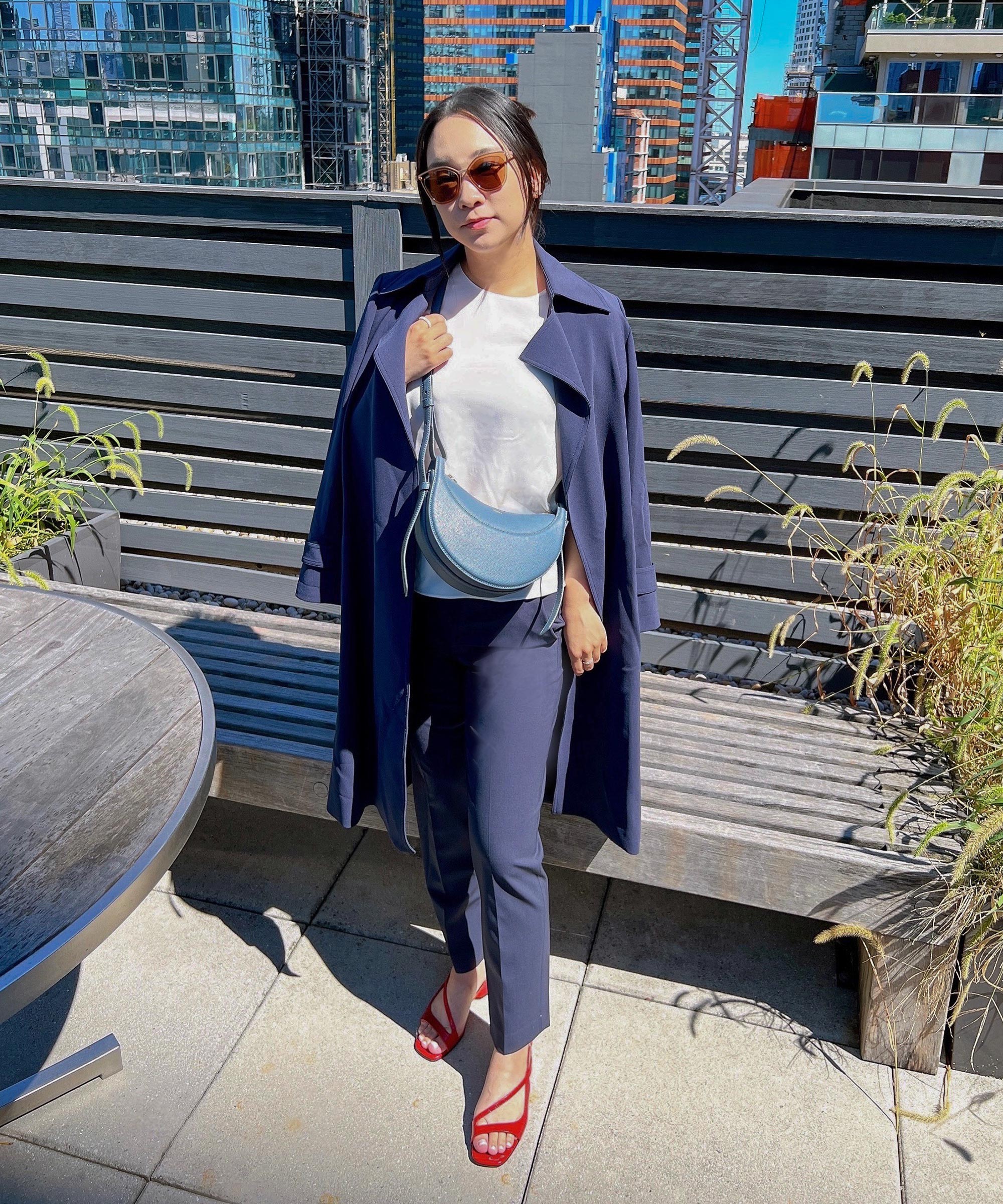 For bottoms, I went with the Treeca Pants in navy. Unlike other tailored pants, it had an ample amount of stretch and was so comfortable to move around and sit in. You could honestly do squats in them — I would know, I tried. Although it’s made out of wool, the pants are silky with temperature regulating and moisture wicking capabilities. To give the minimalist look a bit of sass — since we’re creating a look for the weekend — I slipped on my crocodile print red sandals from Nomasei and my midnight blue Polène Numéro Dix.