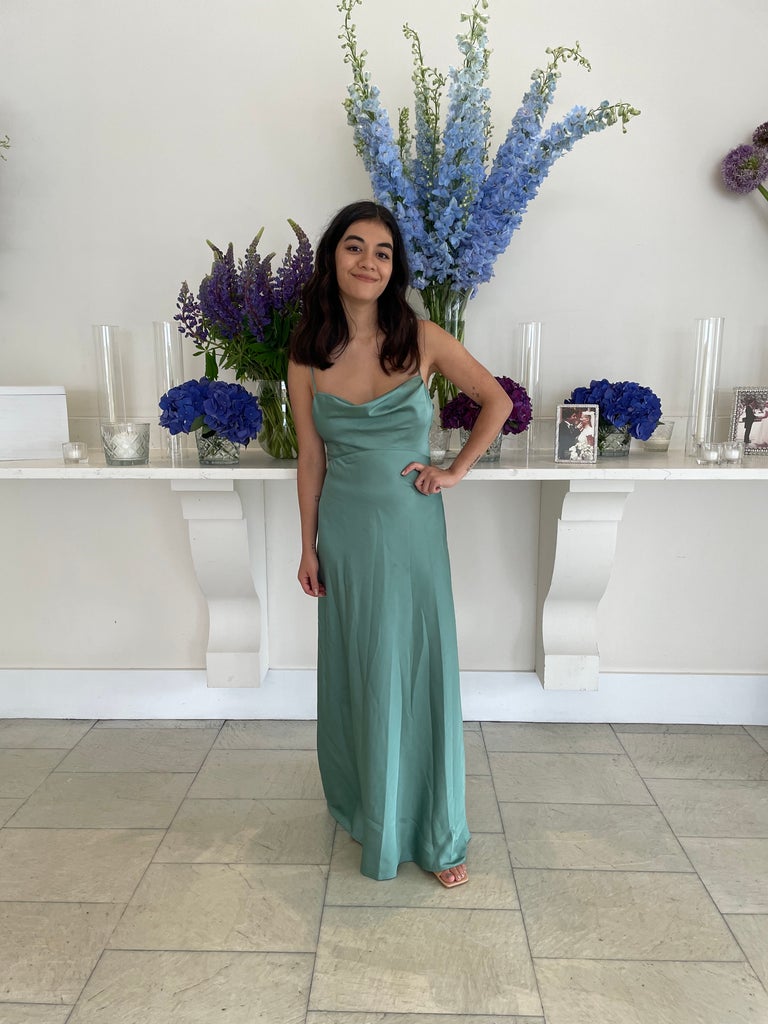Armed with a tape measure and some positive thoughts, I browsed the pages of Fame & Partners formal dresses and settled on a spaghetti strap gown in pistachio matte satin. The site itself is easy to browse based on what you’re looking for, but once you choose a style, the real fun begins.