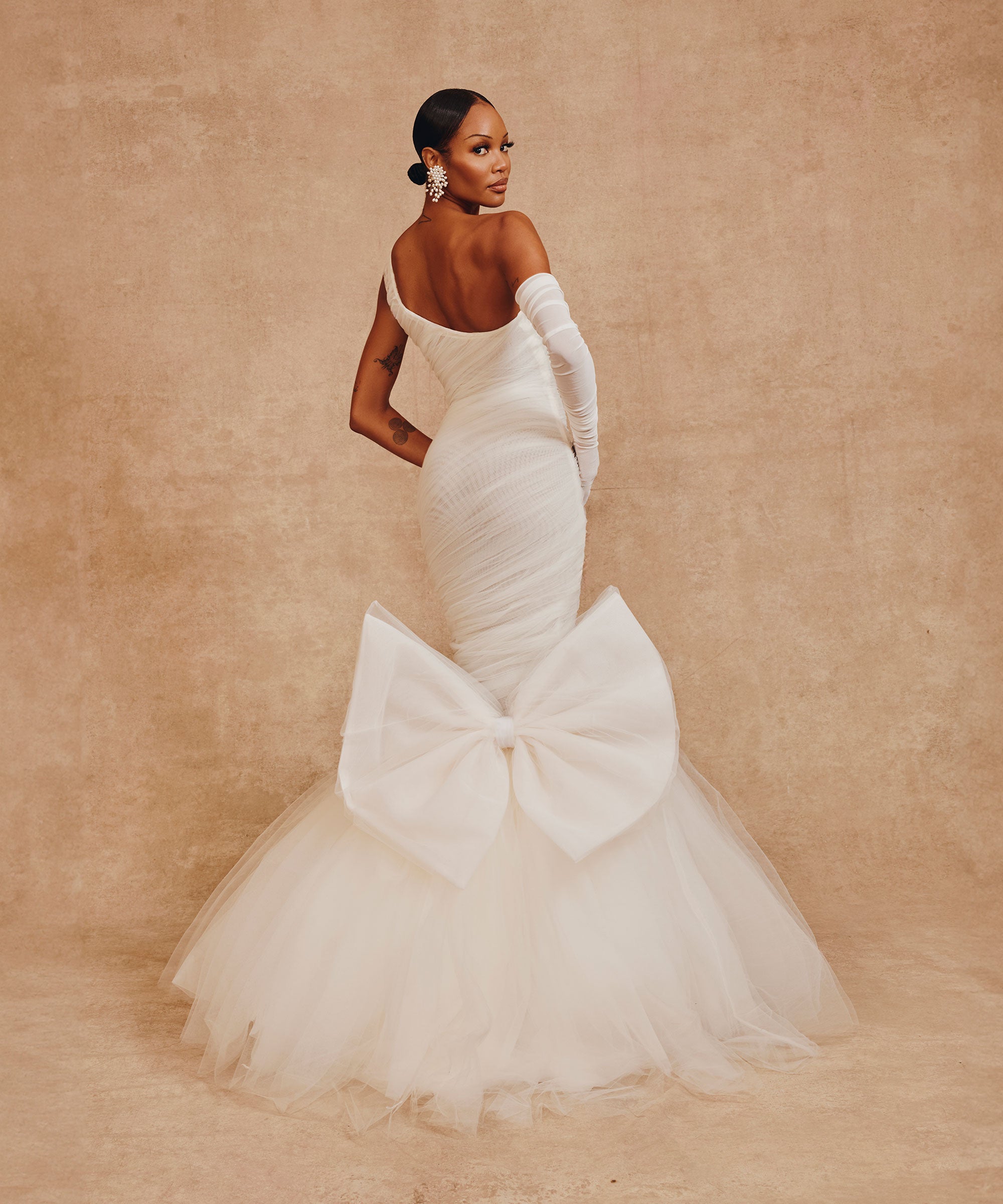 “When you see those beautiful [bridal]shows, it’s hard to kind of see yourself in those pieces because it’s almost like you don’t have access to it,” Mvuemba, whose 2022 engagement has caused her to be rather introspective about the bridal scene, explained during the press conference. “We have a lot of brides coming to [the show]today — when they see these gowns coming down the runway, I want them to see themselves and know that this will be accessible to them. Eventually, I want to offer custom, one-of-a-kind pieces, but we’re going to do ready-to-wear and then do customizable options that can be tailored to your body. My big thing is giving people access.”