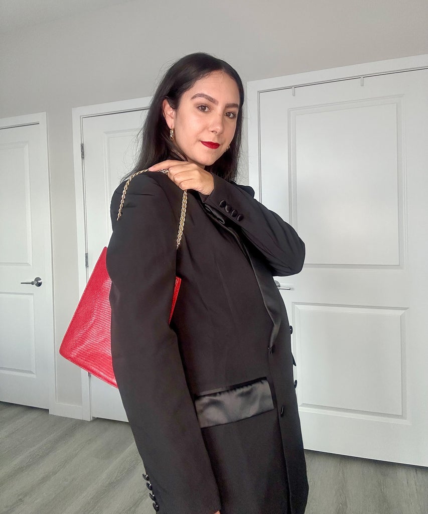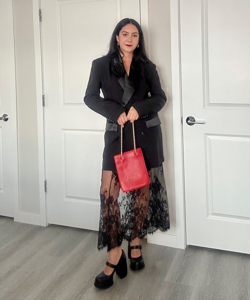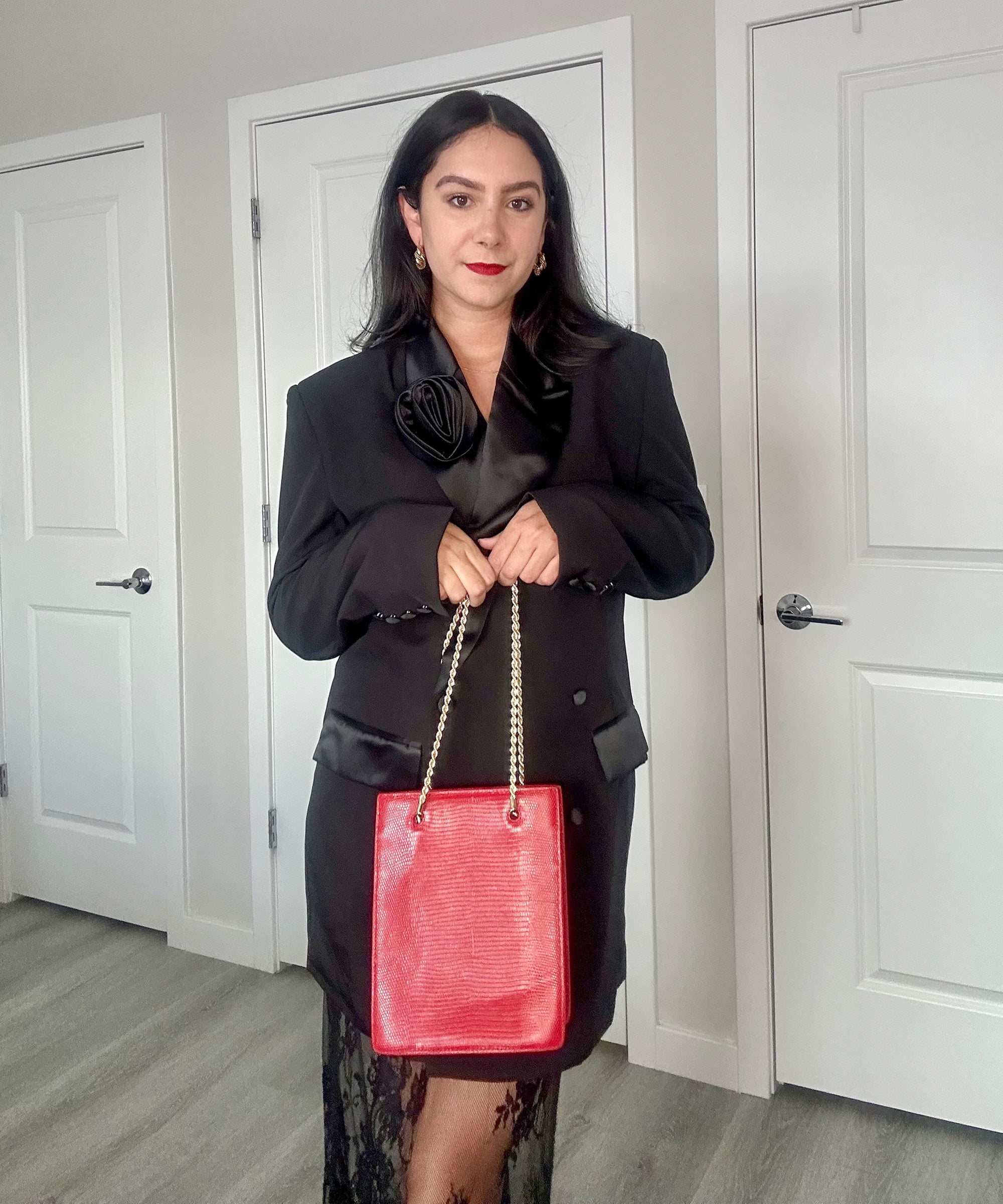 Options included a black tuxedo dress, an open-back blazer, leather pants, and a plum slip dress, as well as more formal selections like a bodycon dress with floor-length scarf detail and long-sleeved velvet dress. All were styles I could see myself wearing and did not involve the usual holiday party accouterments that I hate. Ultimately, I settled for a tuxedo dress with rosette detail from Bardot, a red shopping bag from Loeffler Randall, and gold hoop earrings from Crystal Haze Jewelry, to which I added a lace underskirt and Mary Jane shoes from my own closet. While I did freeze my legs on the way to the party, I was feeling the holiday cheer throughout the night, thanks to my outfit.