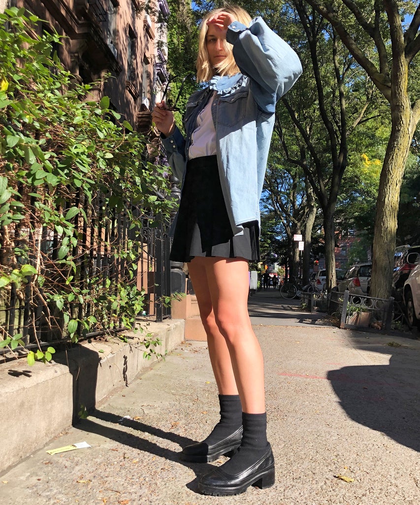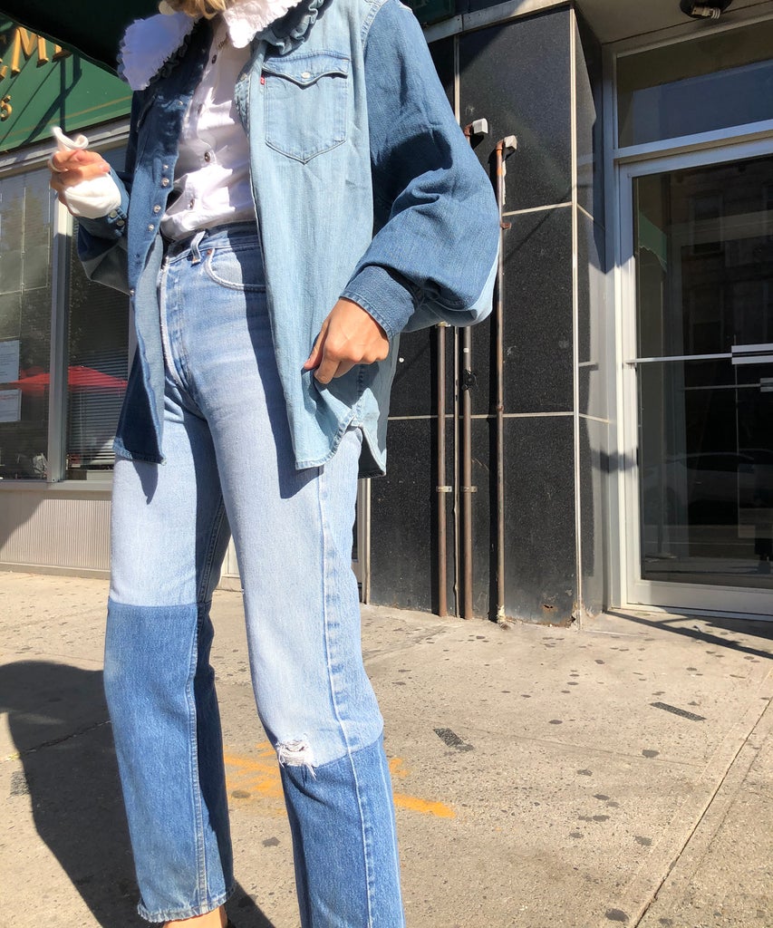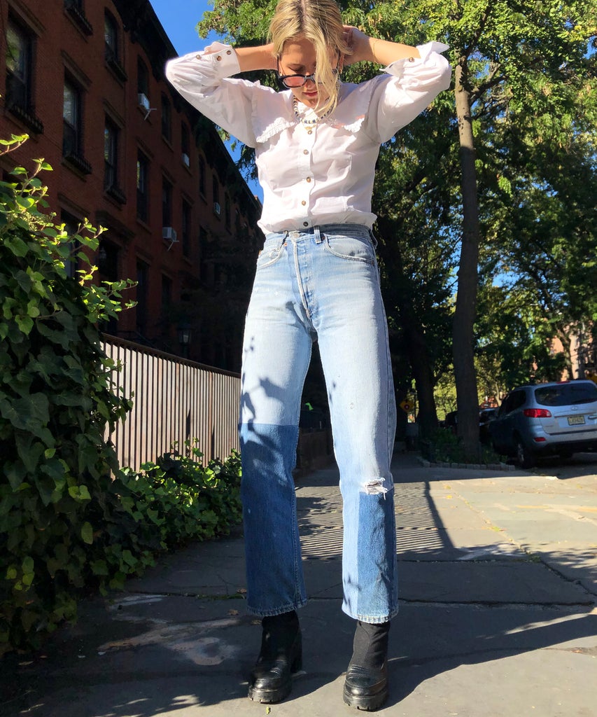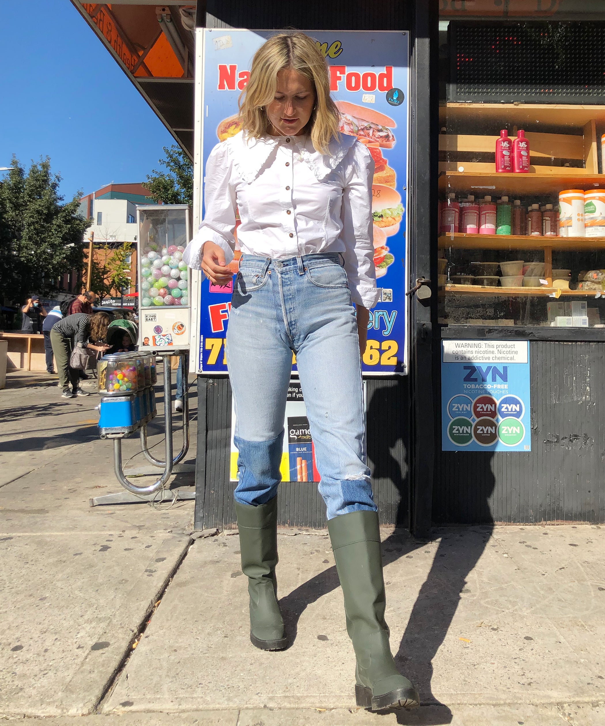 As someone who’s spent many hours in thrift shops and flea market stalls searching for a pair of Levi’s that fits, is worn in (but not too worn in), and doesn’t cost me an arm and a leg — as well as is a fan of Ganni — this seemed too good to be true. I had to try them. Upon slipping on the Ganni Repeat jeans for the first time, though, I was hooked. All of my vintage Levi’s have either been too big in the waist, thus leaving a gap in the back (you know the one), or too tight in the thigh and butt area. I’ve lost count of the many pairs I’ve ripped from trying to compromise on fit in one area just to get it right in another. To remedy that, these have a standard button-fly closing and an asymmetric one that allows for a tighter fit in the waist. (The asymmetric buttons, along with the patchwork details, check off two of the most popular denim trends.) Worn up high, the rise pairs perfectly with a tucked-in button-down, T-shirt, or tank top. Slouched, you can style them with an oversized sweater or a vintage tee. I chose the former, wearing the jeans tighter with a tucked-in white button-down. For one look, I tucked the hems into a pair of hunter green lug-soled rain boots. For another, I went classic with Gucci loafers.